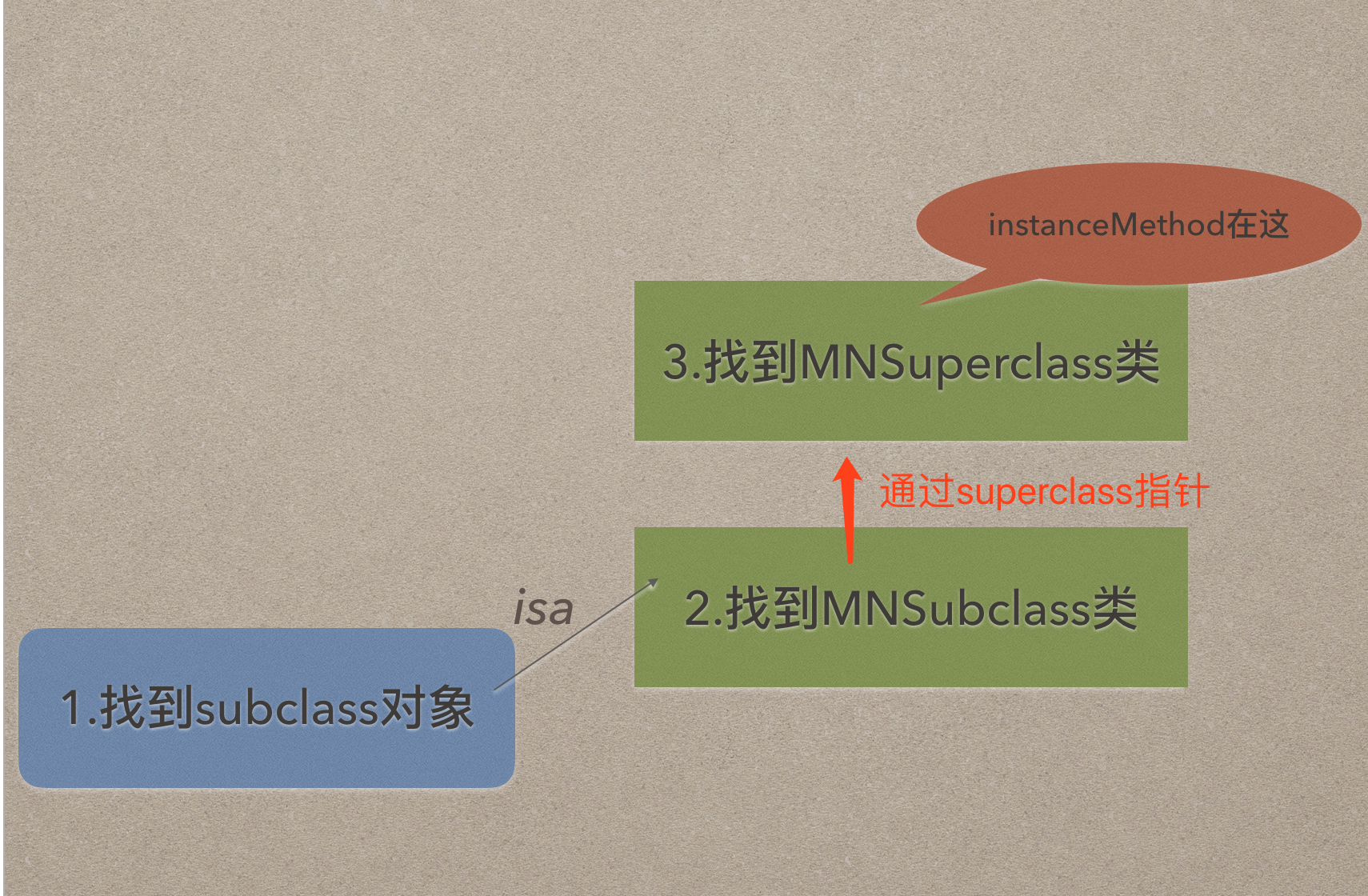 MNSubclass是否有superclassInstanceMethod方法的实现,发现没有,MNSubclass沿着superclass指针找到他的父类 -MNSuperclass - 此时,
