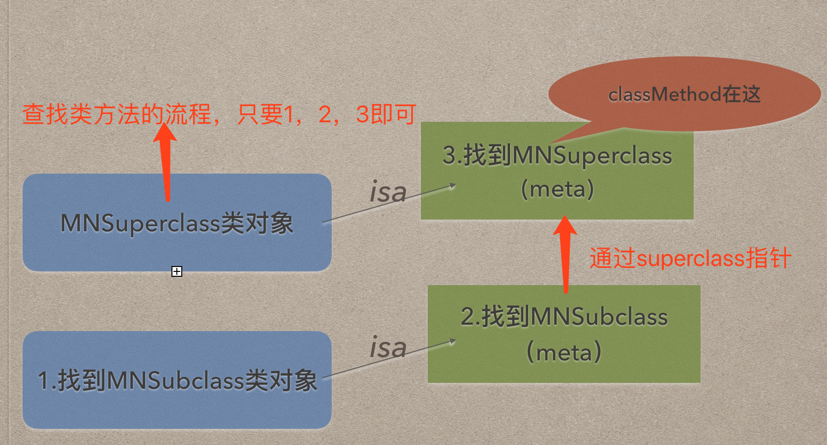 MNSubclass的meta-class中是否有superClassMethod方法的实现,发现没有,沿着superclass指针找到MNSuperclass的meta-class - 发现