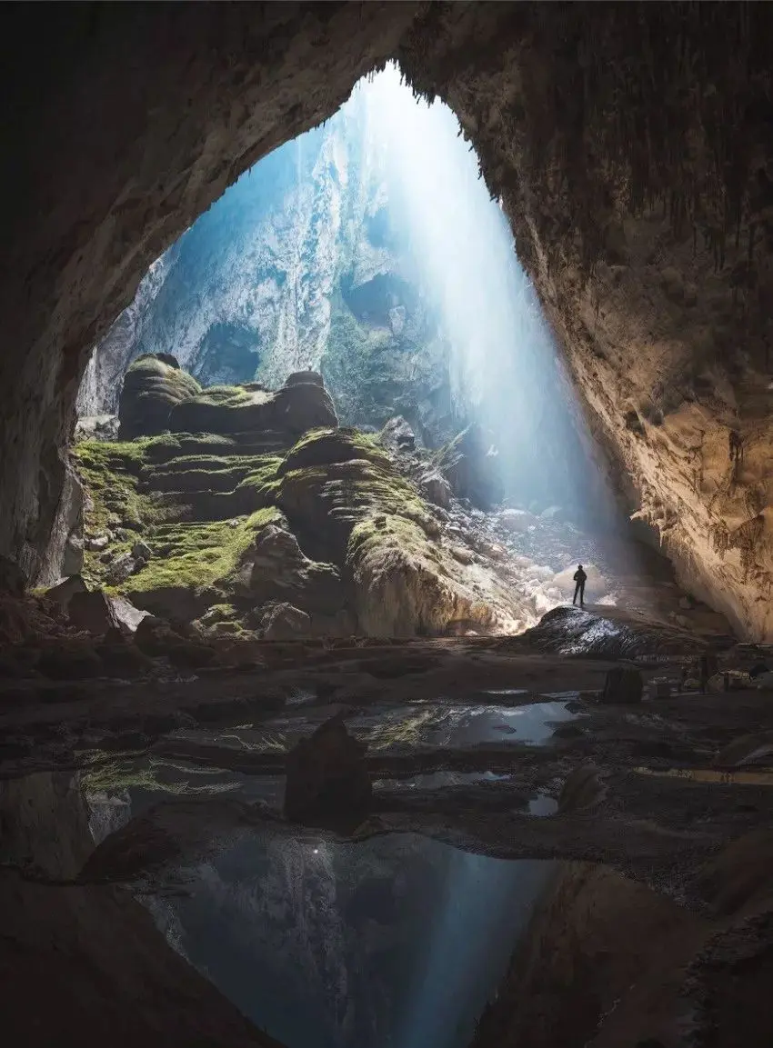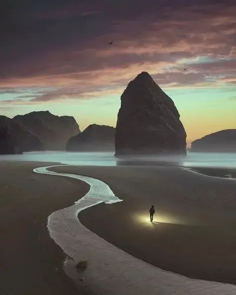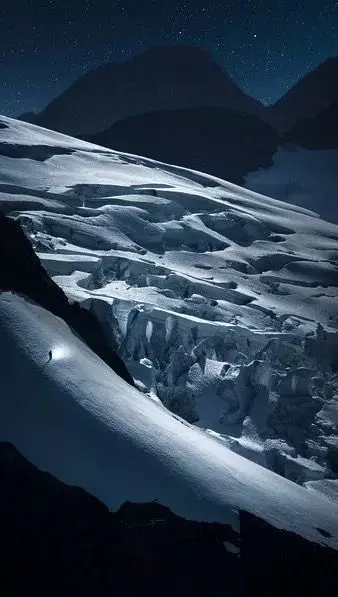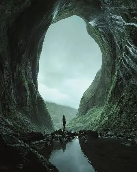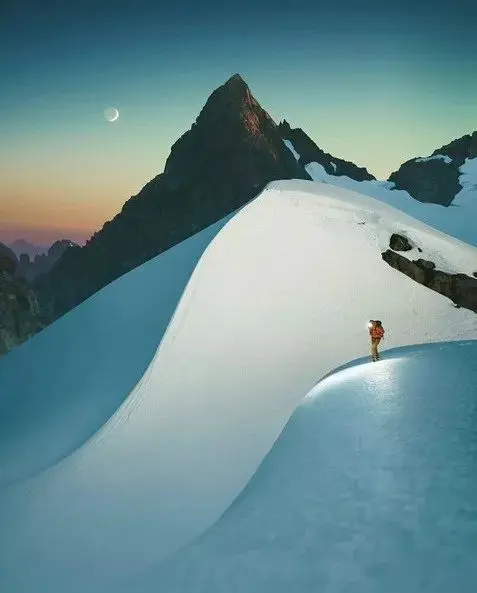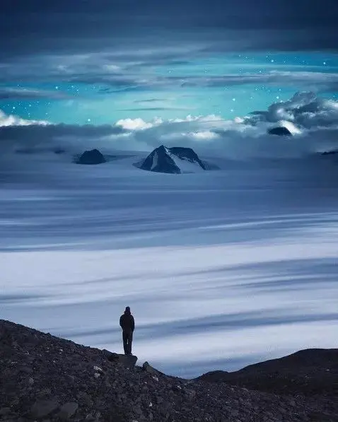 我作为中国人,但是多年留学和旅行,深受登山、探险文化的影响,所以我画面中的人大多是来自画面世界之外的人,是一名“探险家”,从另一个地方来到画面中的世界,去“见证”宏伟壮观的自然景观。