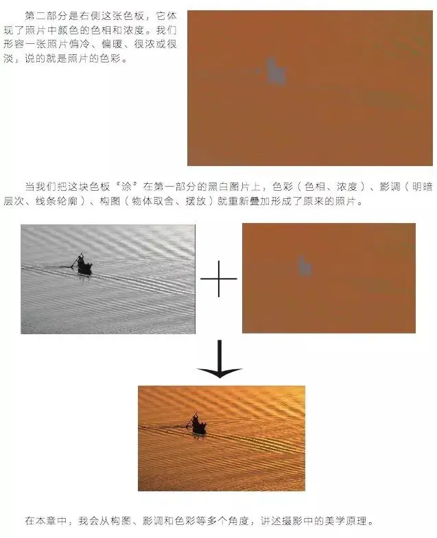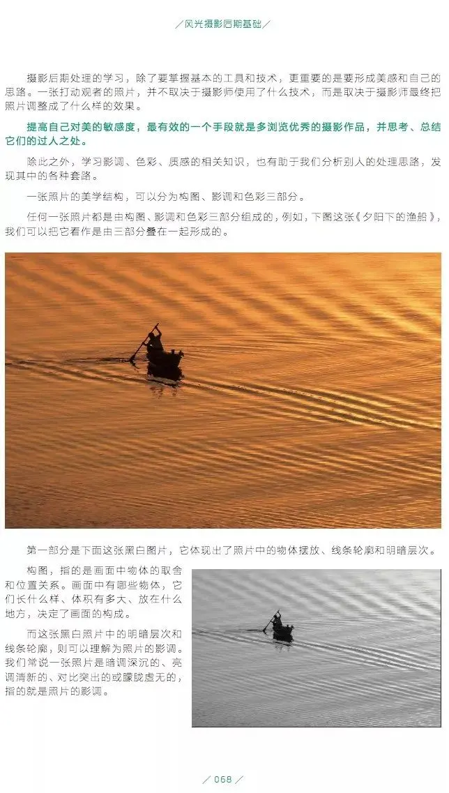 一张照片形式上的结构,可以大致分为:构图、影调和色彩三个部分。所以接下来,我会从这三个方面进行分析。关于什么是构图、影调和色彩,我这里就偷懒直接上我的《风光摄影后期基础》一书中的截图了。
