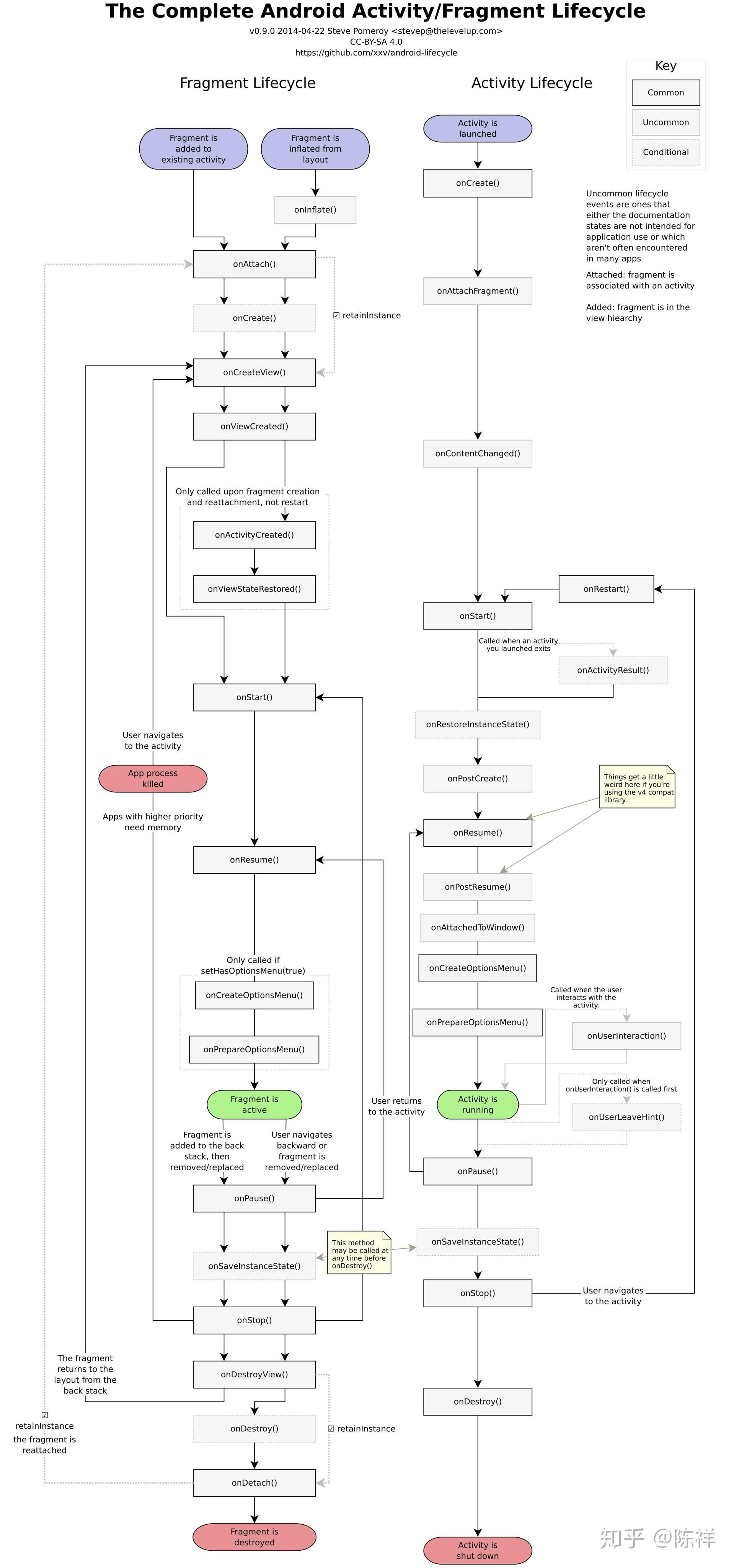 这张图是Fragment生命周期和Activity生命周期对比图,可以看到两者还是有很多相似的地方,比如都有onCreate(),onStart(),onPause(),onDestroy()等等,因为Fragment是被托管到Activity中的,所以多了两个onAttach()和onDetach()。这里讲讲与Activity生命周期不一样的方法。