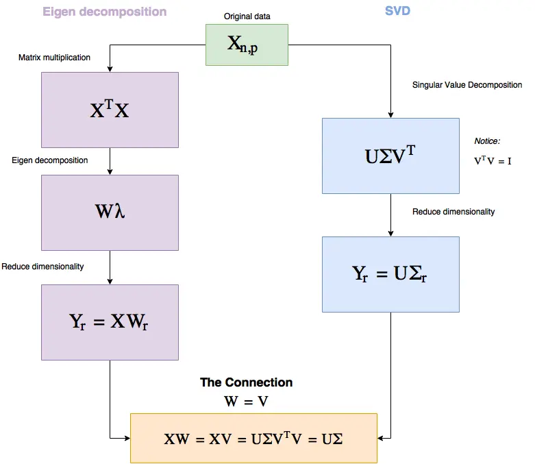 给定 X,以上这两种方法都试图以它们自己的方式,来处理和分解 X,之后我们可以将分解后的结果相乘,以在更小的维数中表示最多的信息。我知道这听起来很可怕,所以这里我将省去大部分的数学知识,只保留有助于理解这些方法优缺点的部分。