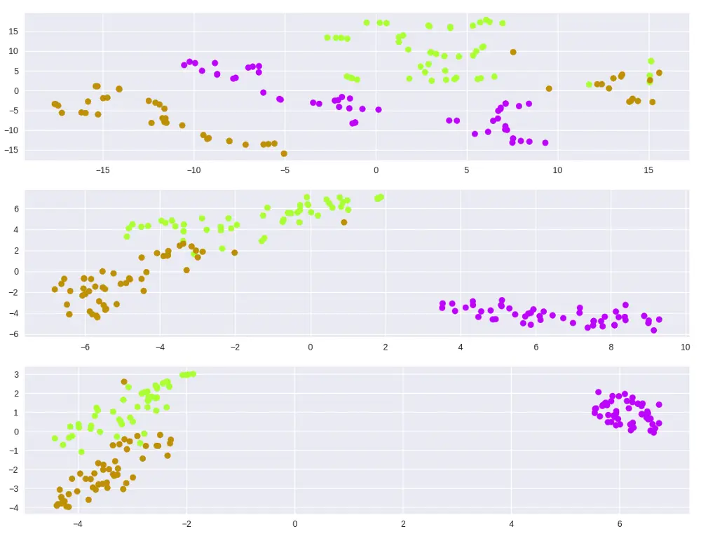 这意味着集群之间的距离和集群大小可能会产生误导,并且也会受到所选择的复杂度大小的影响(再次提醒,我将参考上面文中提到的文章中的方法,以查看这些现象的可视化数据)。
