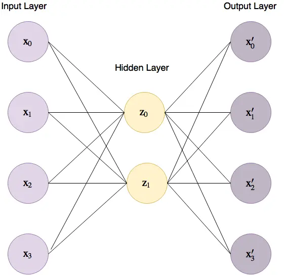 自动编码器是一种神经网络,该网络的目标是通过使用更少的隐藏节点(编码器输出节点)来预测输入(训练该网络以输出与输入尽可能相似的结果),通过使用更少的隐藏节点(编码器输出节点)来编码与输入节点尽可能多的信息。