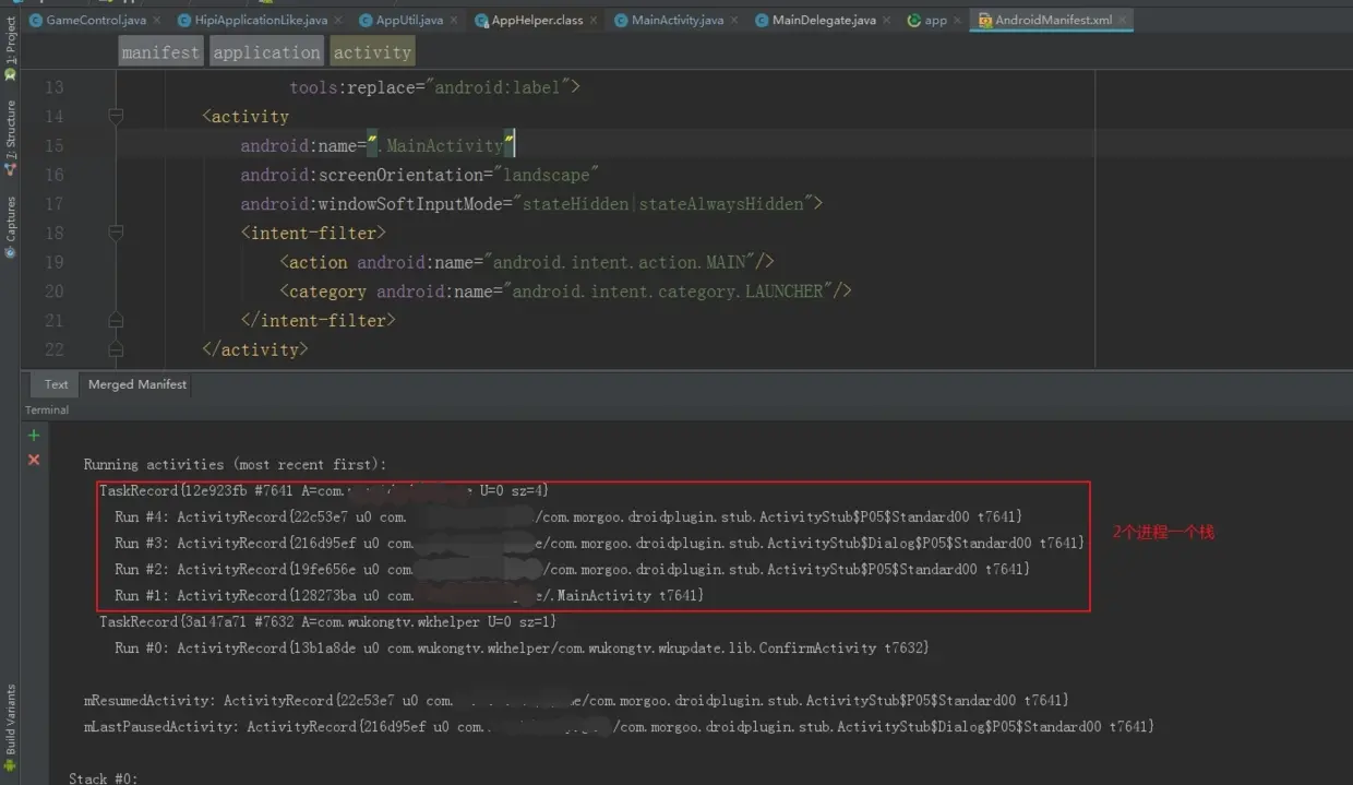 根据前面的推测,针对目前的问题,方案无非就2个,要么让宿主进程在被强杀时不要被系统保存栈记录,要么让宿主进程与插件进程不要共用一个栈。要注意,方案一才是关键,但这个与第3个坑有关联,所以,这里就只说下方案二吧。很简单,修改产品app(宿主)入口Activity的启动模式即可,如把 launchMode 修改为 singleInstance,这样的话,下次通过icon启动产品app时,系统会单独使用一个栈来存放这个入口Activity,从而避免与插件共用一个栈的问题。修改完成后,启动产品app,再启动游戏插件,这时,通过adb命令查看当前栈信息: