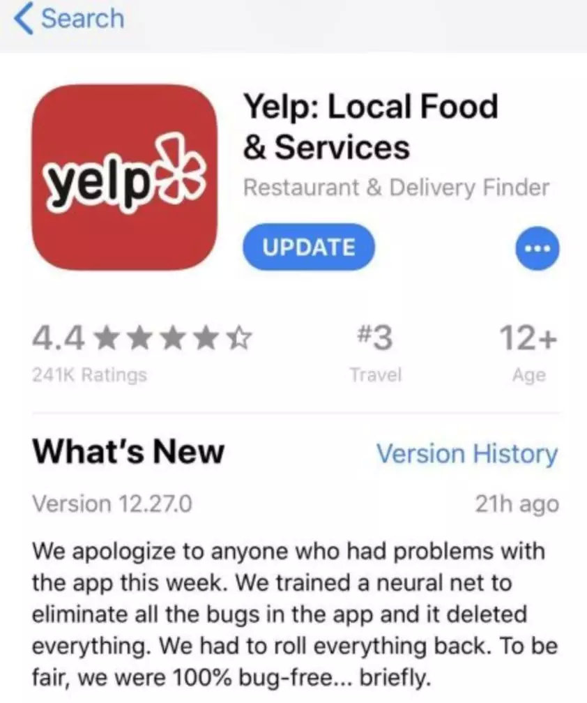 Yelp 团队在 APP 中向近期可能感到体验不畅的各位用户致歉,该团队还表示,他们将不得不进行回滚(Roll back),但随即话锋一转,他们说好的一面是,这说明 APP 中 100% 没 bug 了啊。