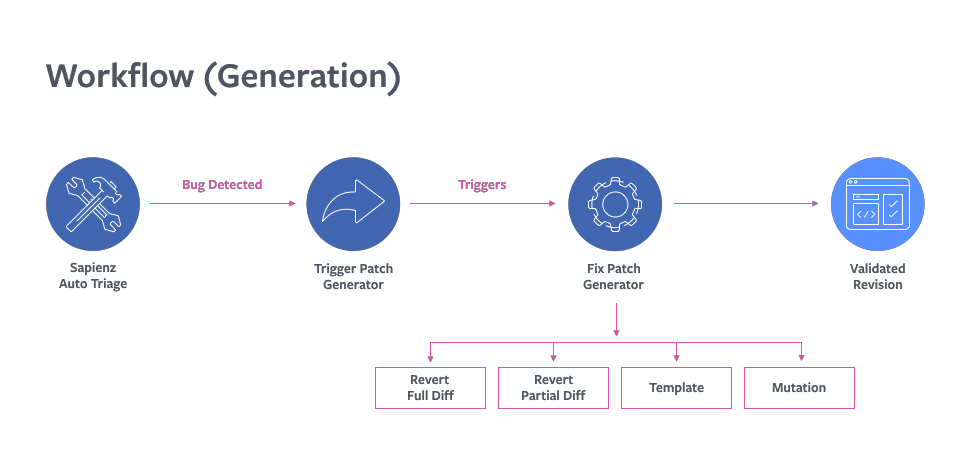 从发现 bug 到修复 bug,Facebook 有一套完整的流程:首先 Sapienz 以及 Facebook 的静态分析工具 Infer,会帮助定位代码中需要修补的点;一旦 Sapienz 和 Infer 精确定位与崩溃相关的特定代码部分之后,就会将该信息传递给 SapFix;最后,SapFix 会参考几种不同的策略,自动生成补丁。