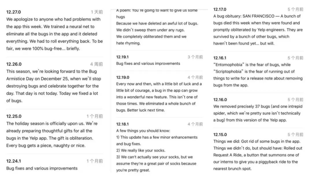代码里面没有 bug 似乎不太可能,翻阅 Yelp 的版本更新历史记录,你会发现这简直是一部“除虫史诗”,你们感受一下:
