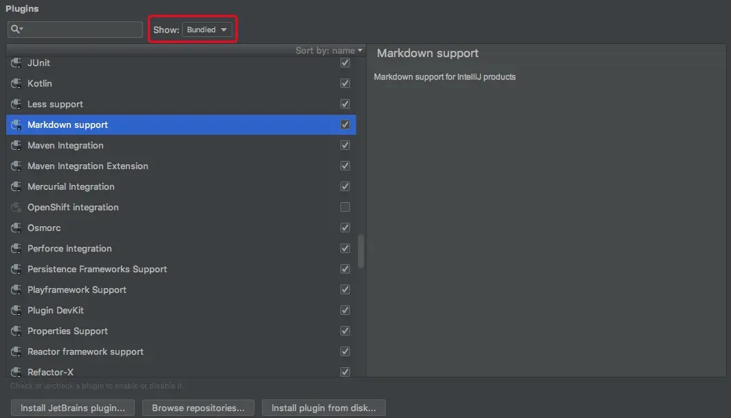 目前很多新版本的IntelliJ IDEA中,已经内置了很多support插件,比如我们常用的markdown support 、UML support 以及 android support等。