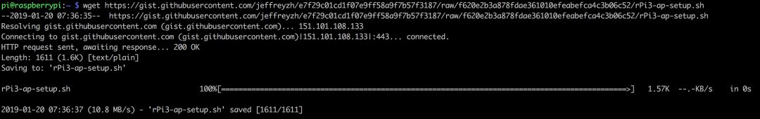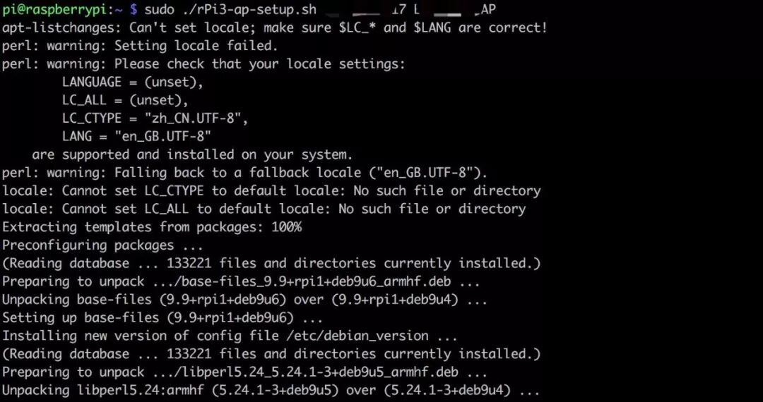 手动配置AP的步骤比较繁琐,可以使用rPi3-ap-setup.sh脚本进行自动化配置,执行以下命令,打码的两个参数分别对应热点密码和热点名称。
