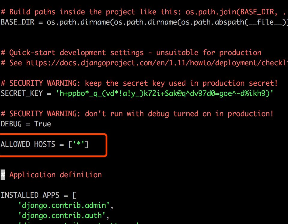 sudo nano settings.py 找到ALLOWED_HOSTS = [''] 在这里请求的host添加* 改为如下: ALLOWED_HOSTS = ['*'],如下图: