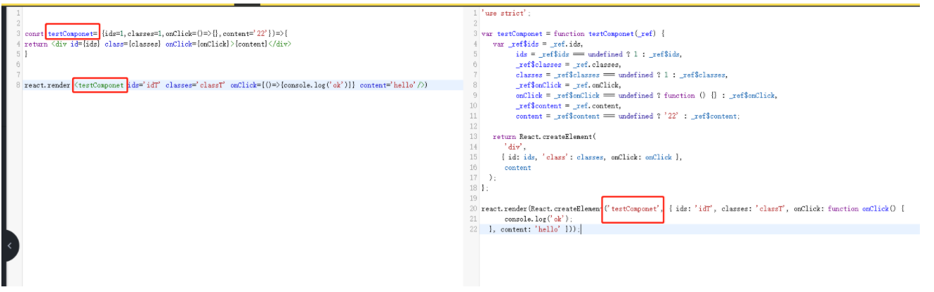 当有组件的时候 jsx的第一个参数变成了变量,如图,参数为变量TestComponet,而不是字符串,