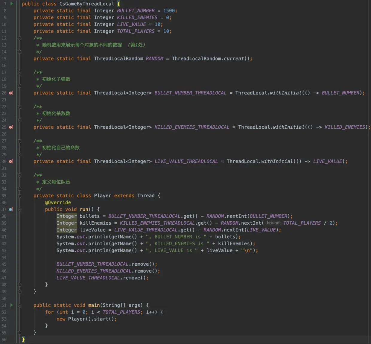 在CsGameByThreadLocal第1处,使用了ThreadLocalRandom生成单独的Random实例;