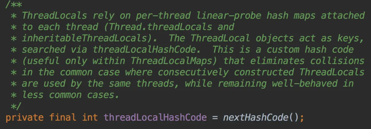 - HASH_INCREMENT是一个常量,表示了连续分配的两个ThreadLocal实例的threadLocalHashCode值的增量