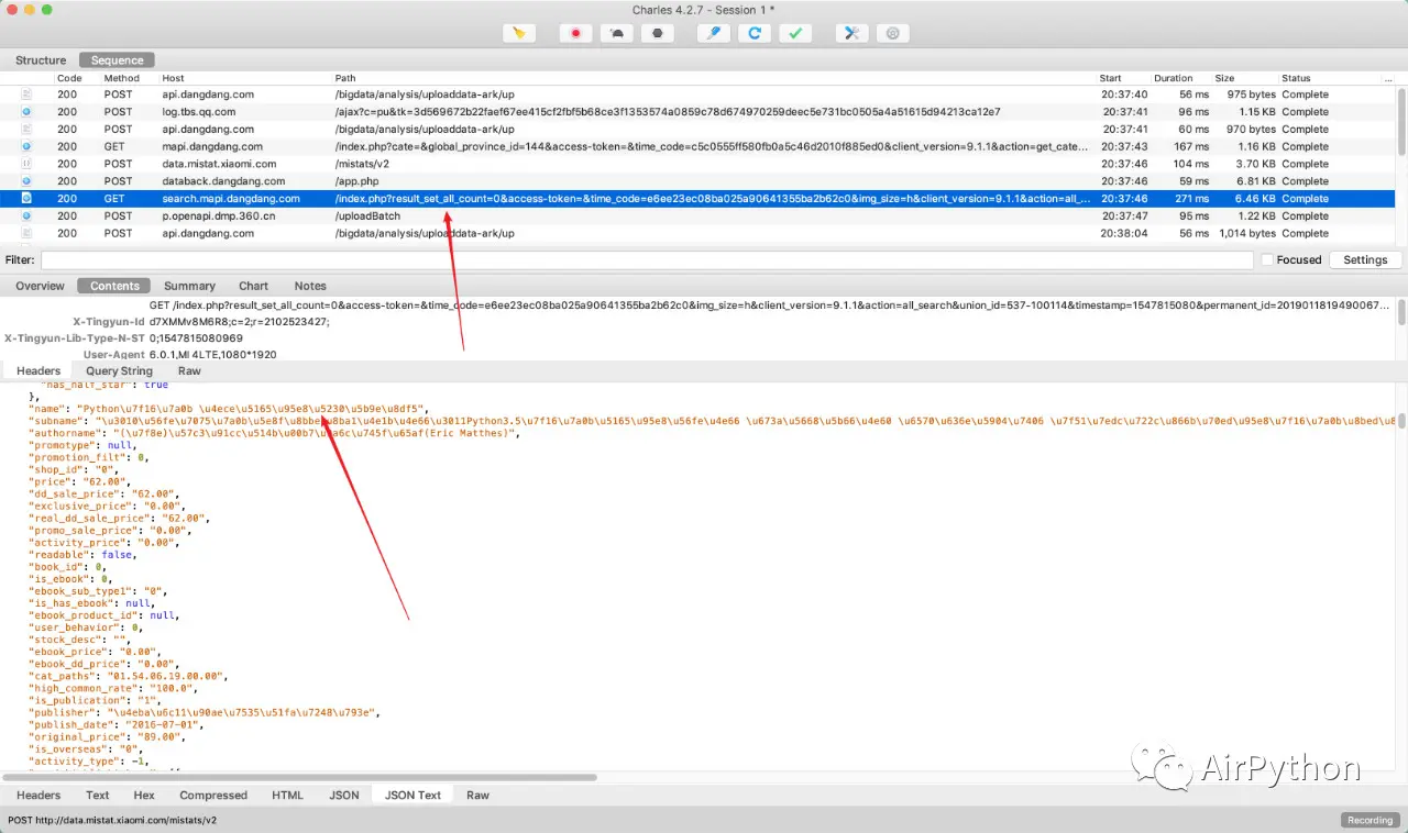 打开当当网搜索商品的页面,搜索关键字「Python」,可以在 Charles 查看到当前请求的 URL 地址包含:「word=Python」
