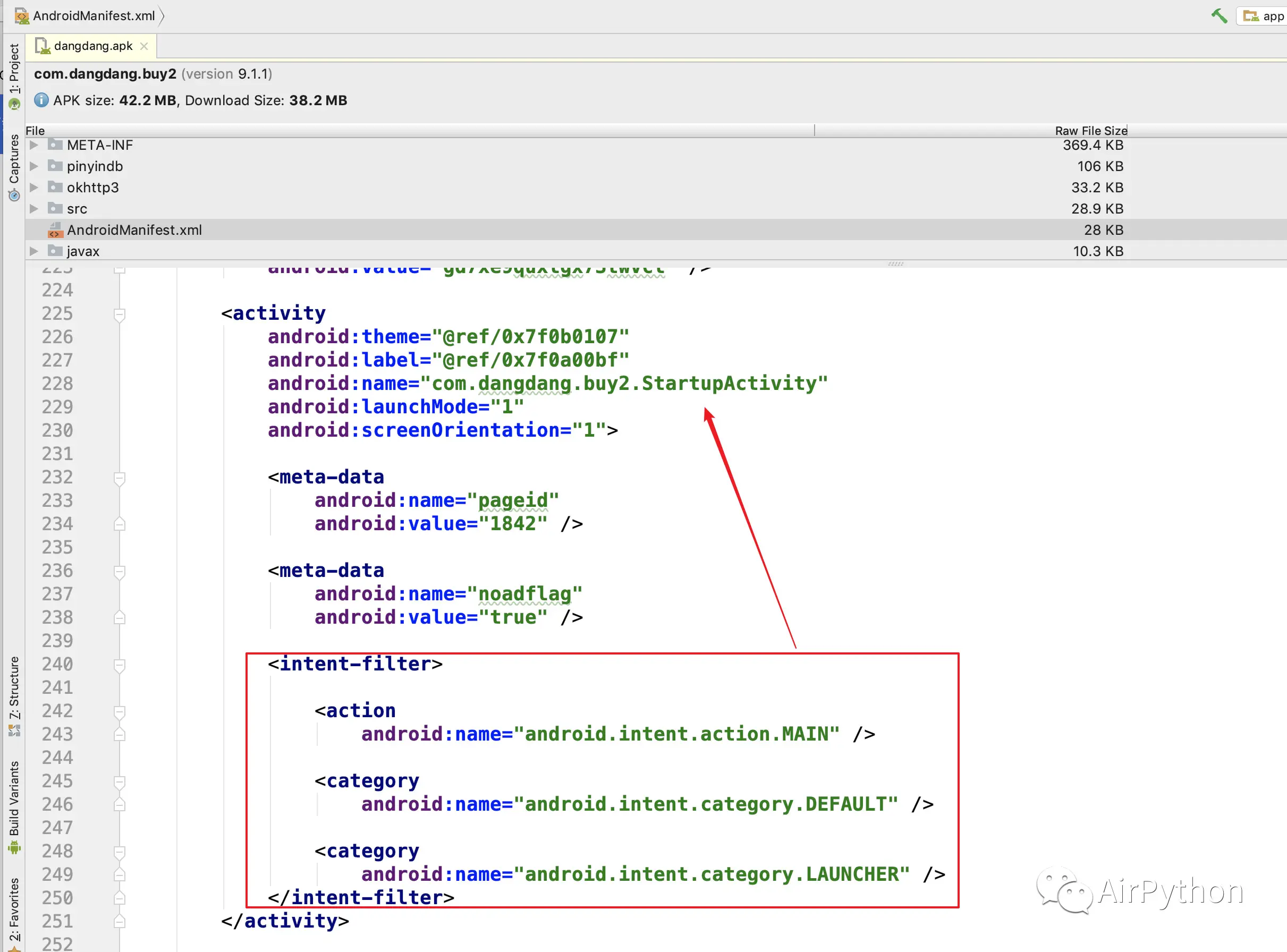 打开 Android Studio,利用菜单栏的 Build-Analyze APK 分析当当网的安卓应用,打开 AndroidManifest.xml