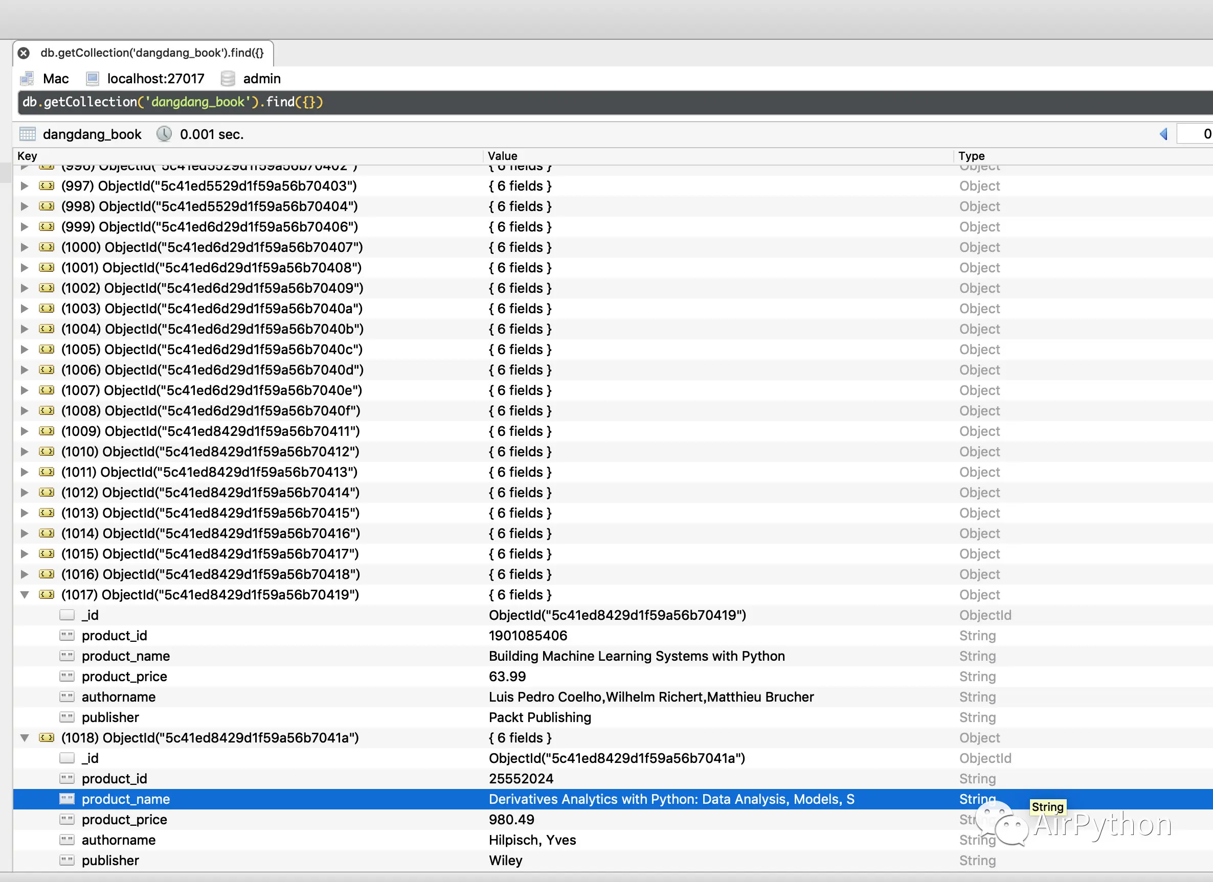 App 会自动打开,执行一系列操作后,到达商品界面,然后自动滑动界面,通过 mitmproxy 自动把有用的数据保存到 MongoDB 数据库中。