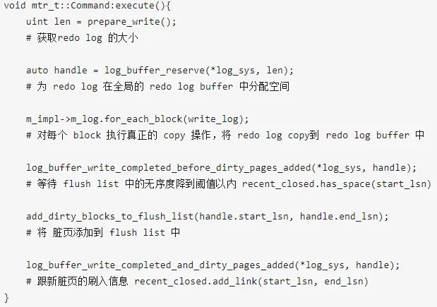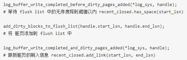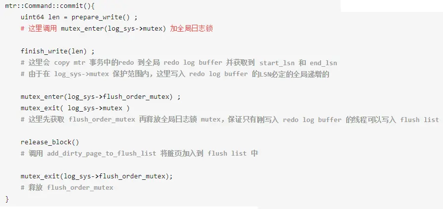 在MySQL 5.7中,Redo Log写入全局的Redo Log Buffer以及将脏页添加到flush list的操作均在mtr的提交阶段中完成,简化后的代码为: