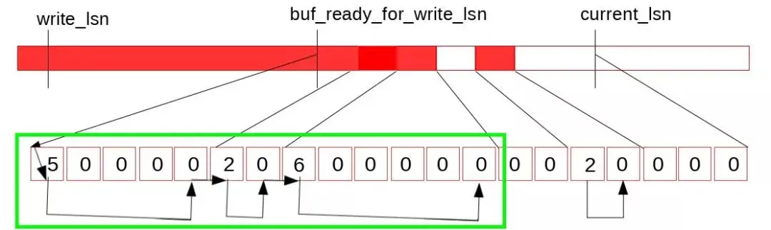 由于多个MTR并行copy数据到Redo Log Buffer,那必然会有一些MTR copy的快一些,有些MTR copy的比较慢,这时候Redo Log Buffer中可能会有空洞,那么就需要一种方法来确定Redo Log Buffer中的哪些内容可以写入文件。MySQL 8.0中引入了新的数据结构Link_buf解决了这个问题。