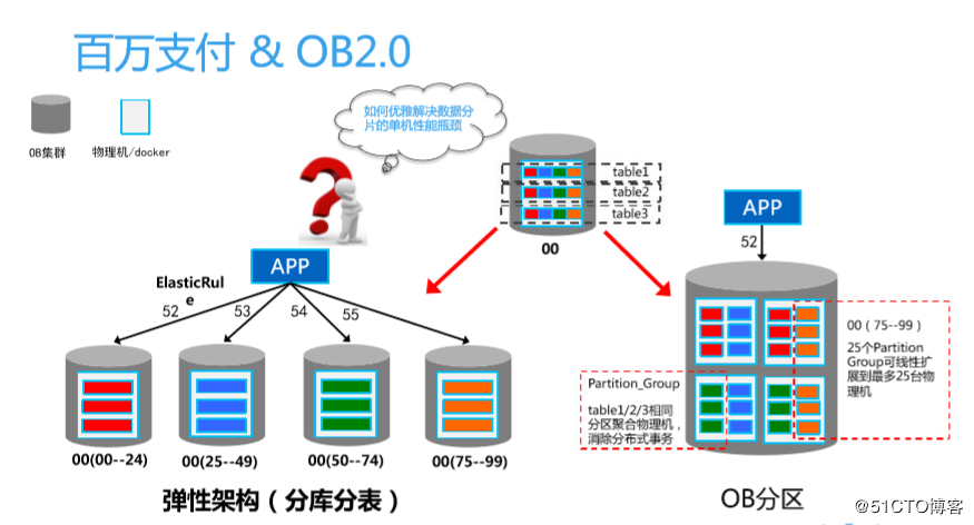 OceanBase2.0的一个理念是针对性的解决数据分片的单机性能瓶颈。下图中上面有一个DB,假设它服务所有的UID是00的支付宝用户,00中有三张表,其中四有颜色,它们代表事务跨越三张表,三张表里面任意一个人交易的时候所用到的数据在不同表中使用了相同的颜色。如果在交易时00库扛不住了,传统的方案落到DB就是分库分表。新起一套库,这套库是原来容量的四倍,同时把原来三张表按照相同的规则分到独立的库中,再通过ElasticRule告诉底层路由从不同库中读取数据。但是分库分表有几个不友好的点,首先业务感知到了,所以要追溯到数据源。其次,应用统计上链路都是独立的,无法共享。还有数据库拆分之后,但是缩容时是不是要保留四个最小规格,这便是长期存在现象的尾巴。最后,之前配套的工具都要进行改变。OceanBase2.0采取的方案是分区(Partition),数据库的数目并没有增加,但是可以按照一定规则,将满足相同分区规则的数据聚合在同一个机器上。这能够很大程度上提高单机的性能,解决未来支付能力上升的瓶颈问题。