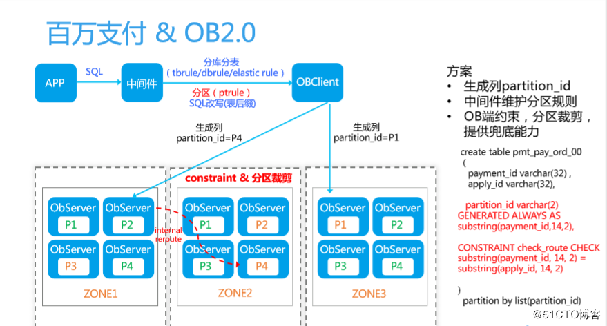那么OceanBase2.0架构下的路由是怎么工作的?一个服务器过来发给SQL,SQL传给中间件,中间件提供路由功能,它把分库分区表的规则做好,比如表级别的规则,DB级别的规则,弹性的规则以及分区的规则。中间件把分片的信息发送到OBClient, OBClient会制造一个生成列partition_id,发送给OBerver,由做一个分区裁剪。分区裁剪会精确地找到分片所在的DB上的应用服务器在哪里。生成列与业务方绑定在一起,从业务日常表的列中选取两位最适合的做分片,孕育出来生成列的规则应用在表级别,全栈的表都采用这样的规则。另外,分区规则的维护是一个固化的规则,OceanBase通过约束能力(constraint)提供分区裁剪能力,这时不要求中间件有分区裁剪能力,只要把约束定义好,把OceanBase调到最佳就可以了。