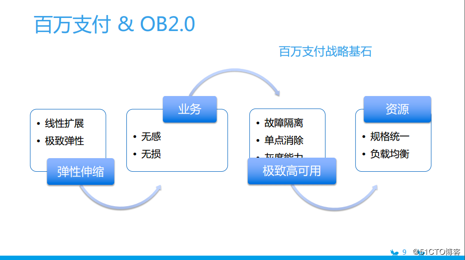 弹性。弹性指的是将所有服务,包括从前端入口、应用服务器、数据库以及网络,通通从原本的服务站点很快地迁移到一个全新的站点上面去的能力。此外,还需要在迁移的过程中将原本一秒八千多的支付能力拓展到四十多万的支付能力。