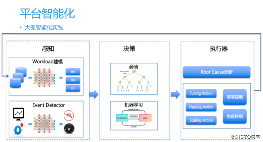 决策。第一种方法是靠人的经验,形成一个决策树,对每一分支进行分析,往下寻找修复。第二种方法是机器学习,根据一些算法做输入,通过演进和优化不断得出最佳的决策方案。执行器。根据上层信息诊断得出需要执行的方案,比如需要调优,扩容或者其他。对此做好幂等控制和免疫控制。因为有些执行不是无损的,可以实时感知线上链路的变化,做成一个可监控可回复的模块来实现变更的免疫。
