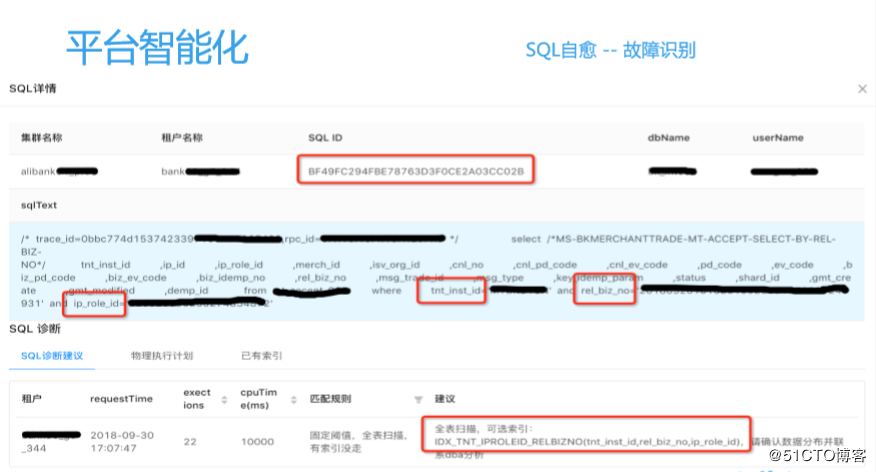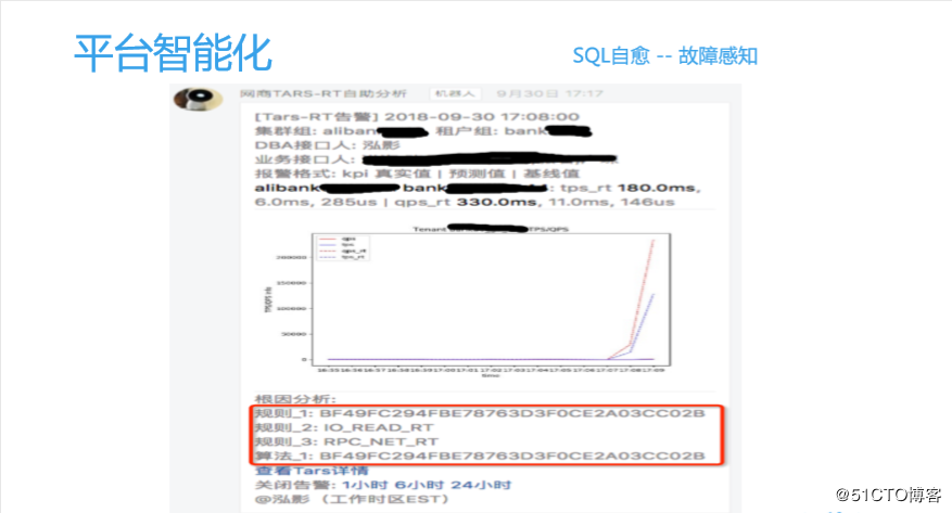 故障识别。通过故障根因分析,给出三个规则。第一个是SQL id,就是指SQL有问题。第二个是IO出问题。第三个RPC出问题。通过分析得出概率比较高的问题,认为规则1里的SQL可能是问题所在。