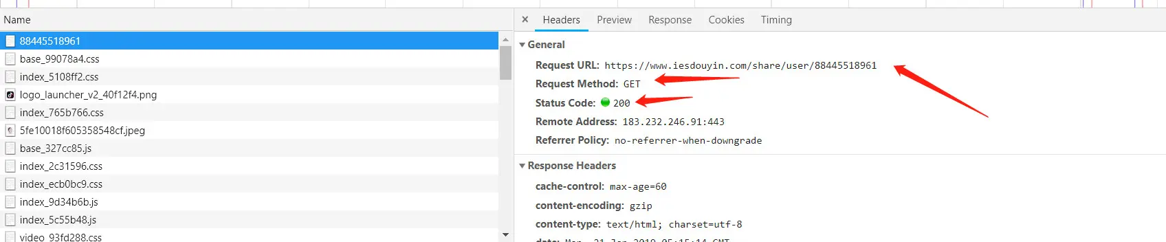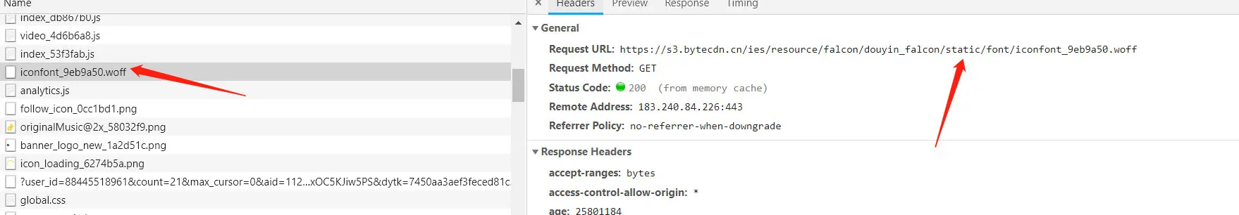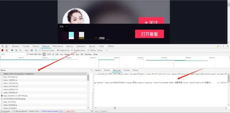 可以看到一堆编码,而且都是数字变成了这样,所有抖音将这些数字的数据都做了字体进行映射,用了他们自己的字体,那我们可以看看开发者工具的 network 查看他所用的字体,一般都是 wolf 或者 ttf 结尾的,可以看到: