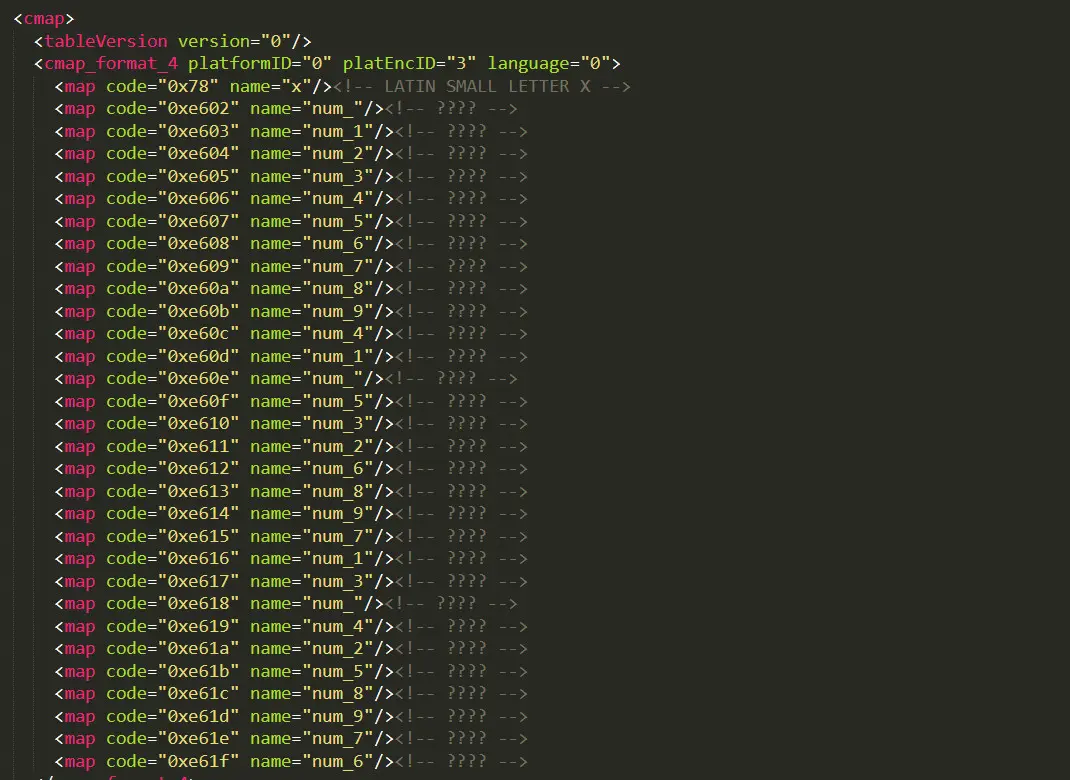 下载完之后我们可以用 Python 的一个工具包 fontTools 来查看字体映射。