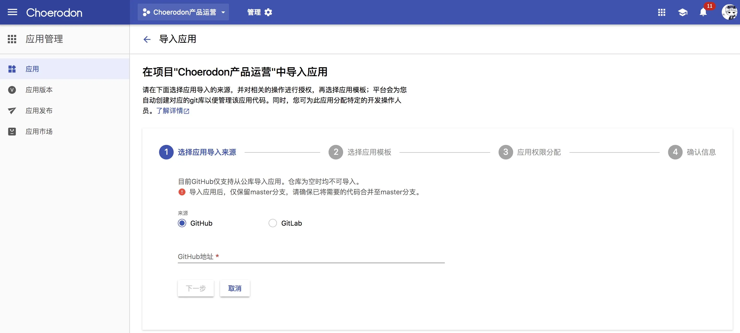 应用管理模块新增导入应用的功能,支持从Github和GitLab库中导入已有应用,并按照所选应用模板为导入的应用添加相应的文件。