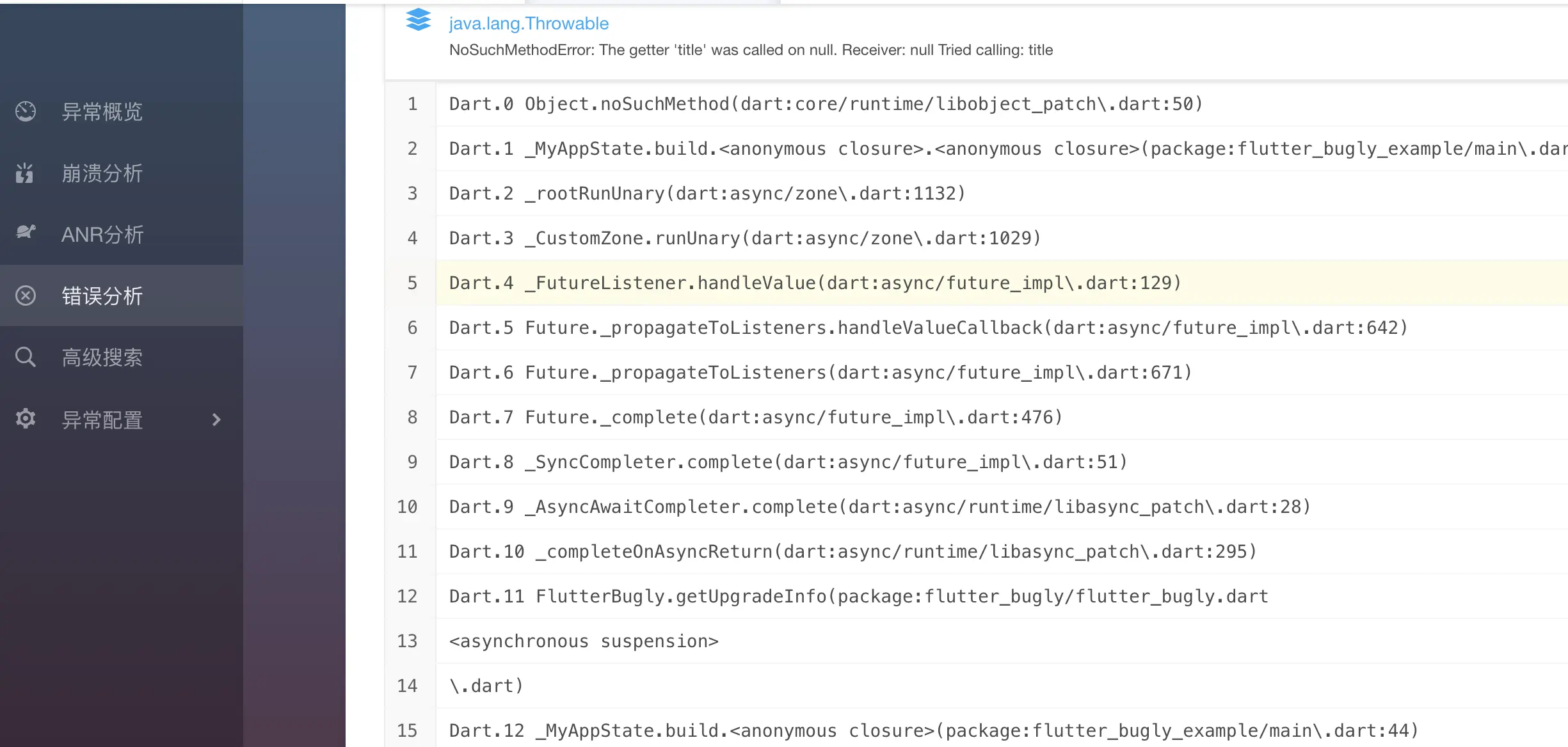1、flutter异常上报不属于崩溃,所以如需查看flutter的异常上报,请在【错误分析】tab页查看