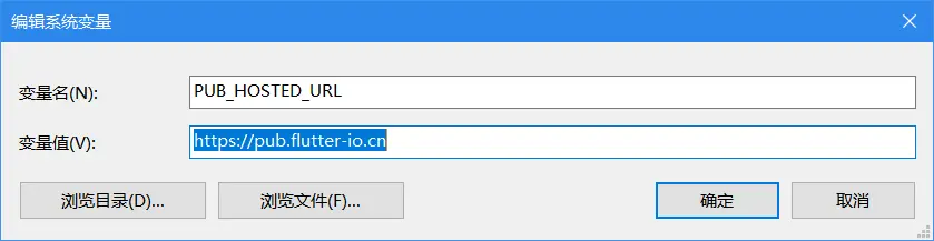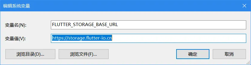 然后再添加两个系统变量,PUB_HOSTED_URL和FLUTTER_STORAGE_BASE_URL是谷歌的国内临时镜像