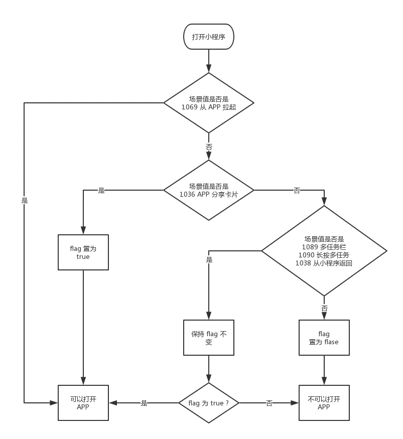 条件严格的情况下,我们根据,场景值来判断进入小程序的状态。引用官方流程图,其中场景值为以下其中一个时,拥有打开app功能1069、1036、1089、1090、1038。设置一个变量为flag来判断是否拥有打开app功能。