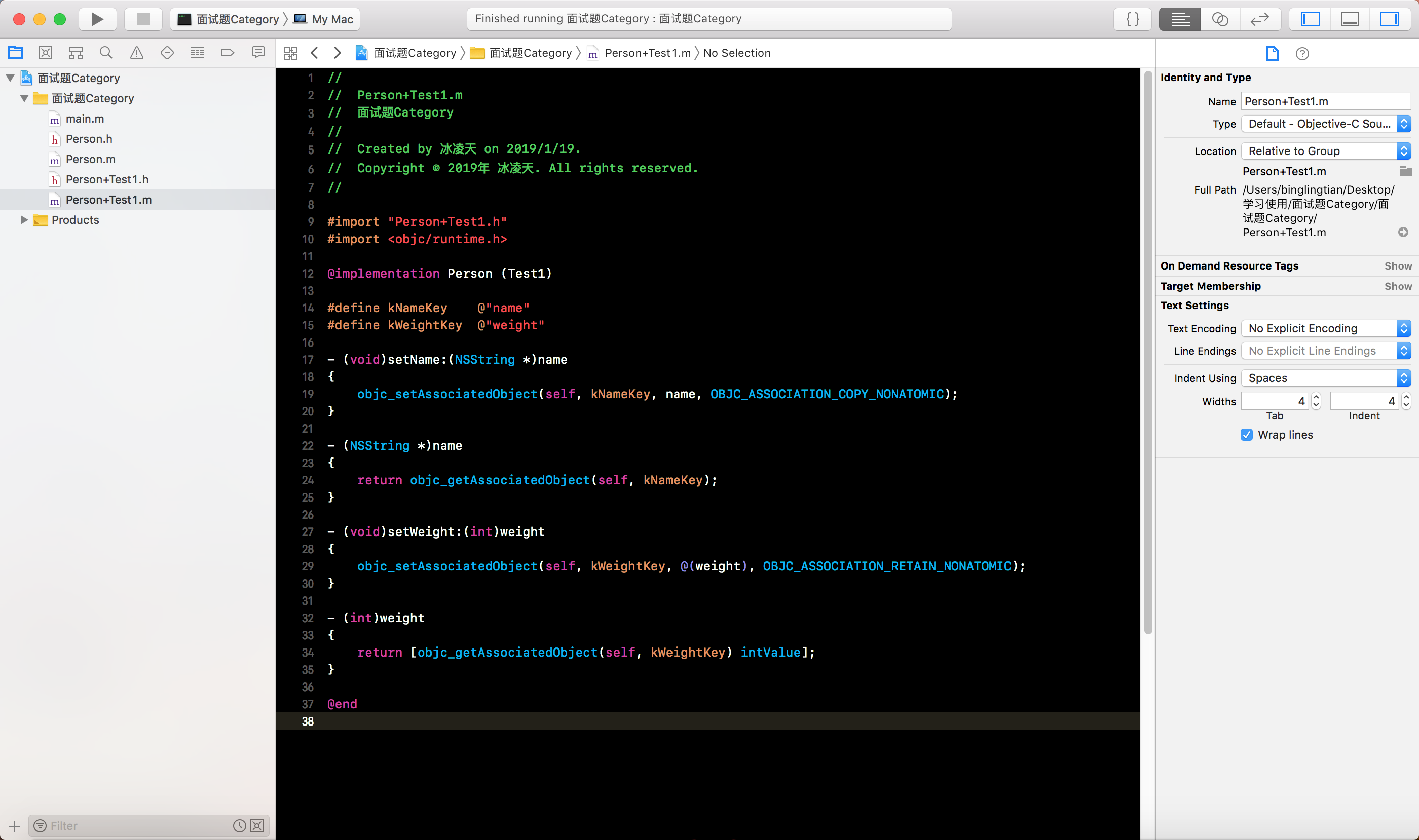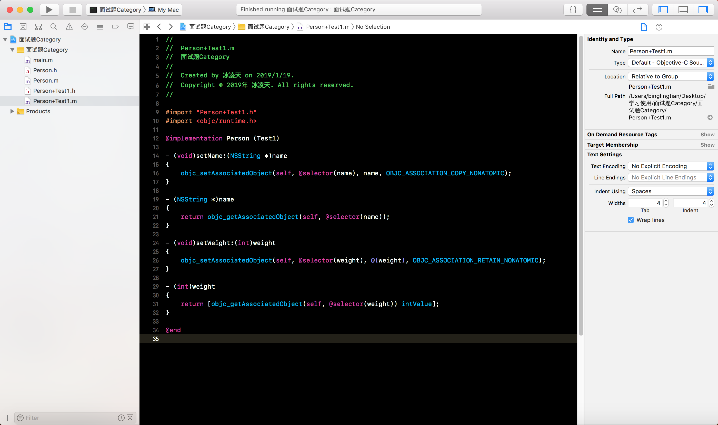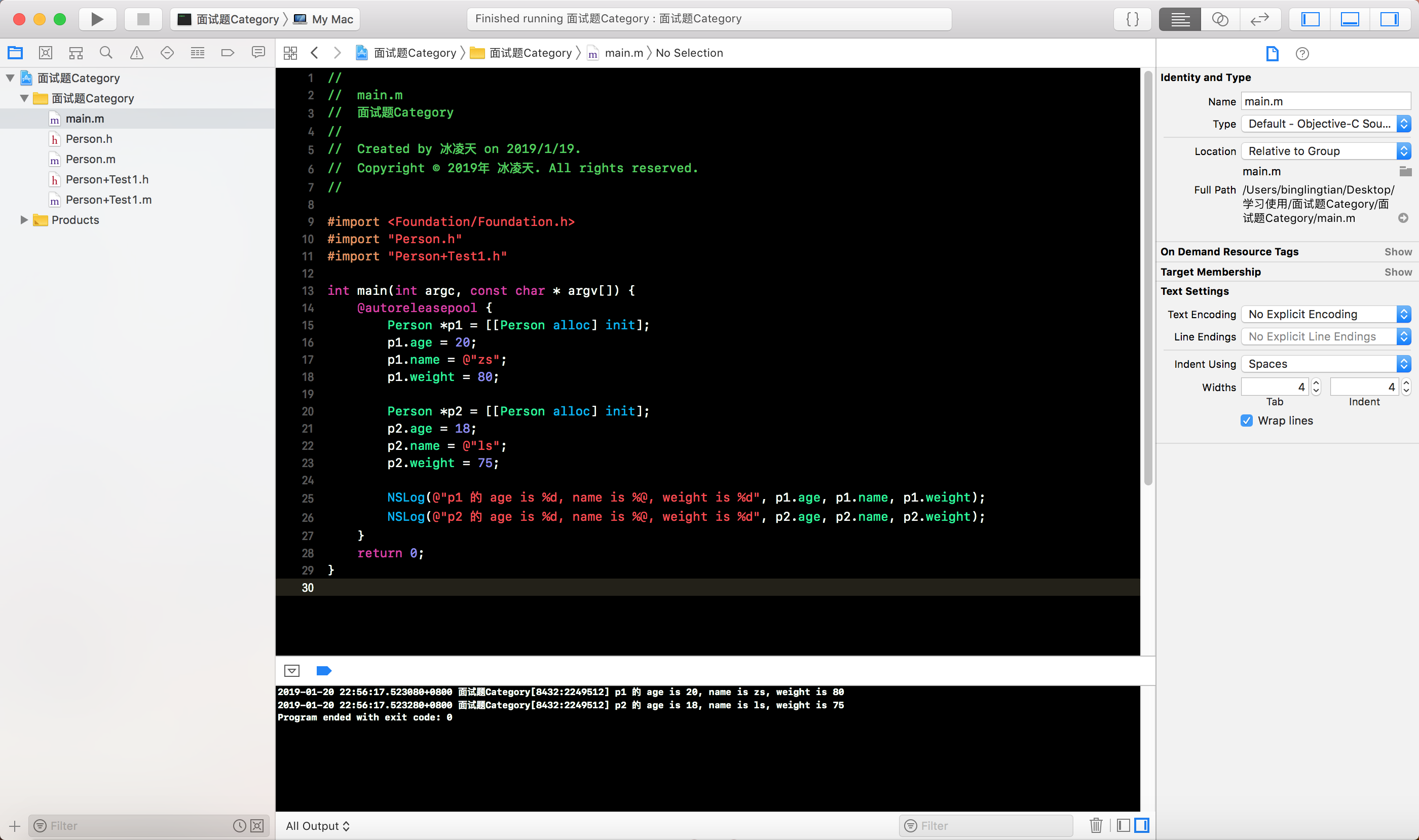 Person类的分类Person+Test1, 有两个属性, 分别是int类型的weight和NSString类型的name