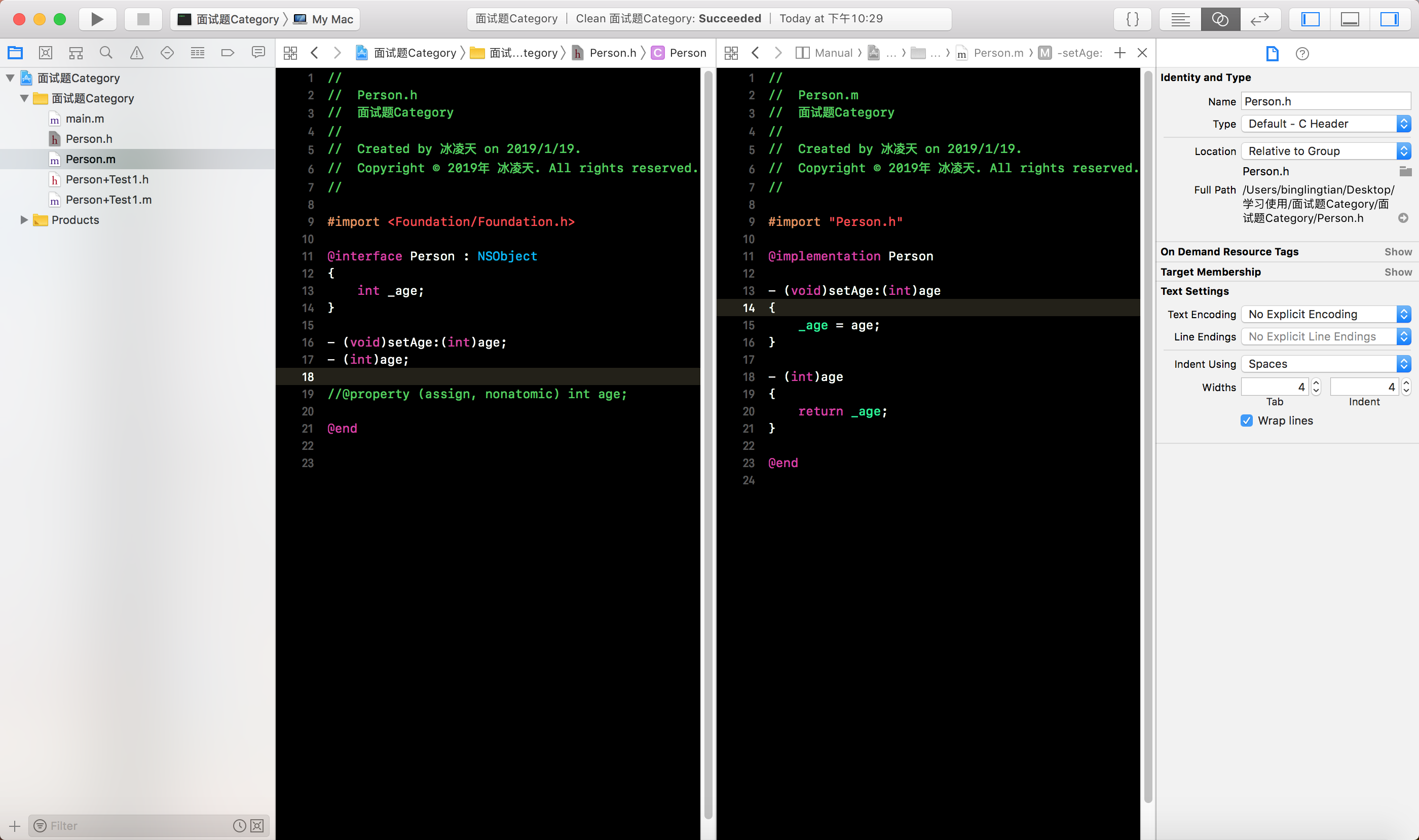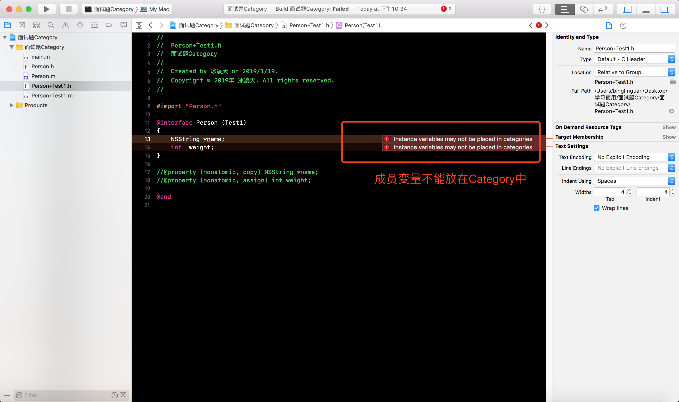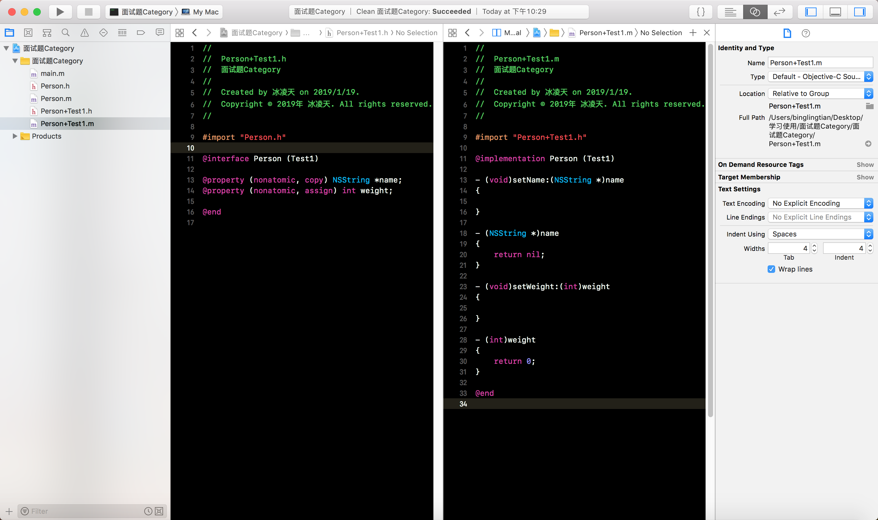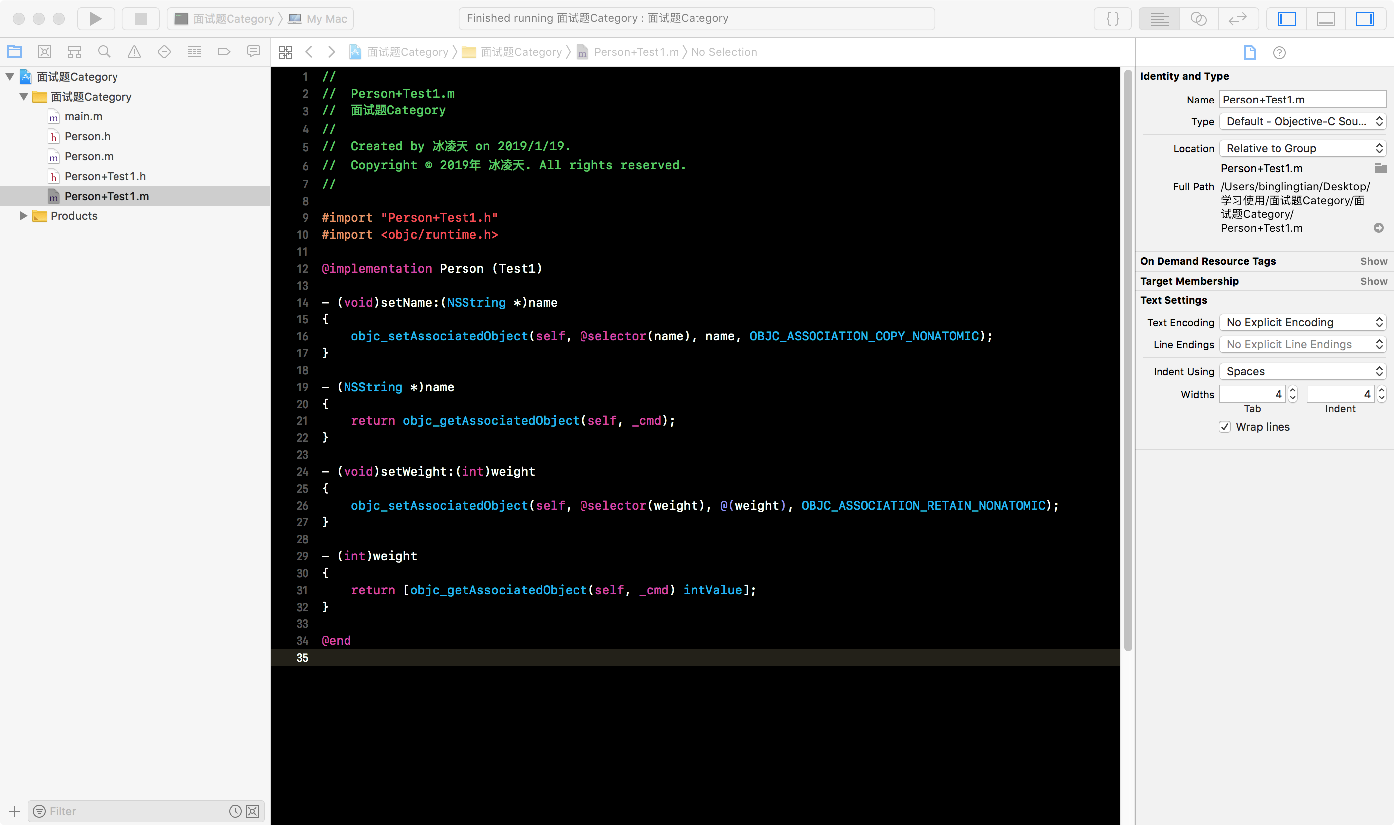 Person类的分类Person+Test1, 有两个属性, 分别是int类型的weight和NSString类型的name