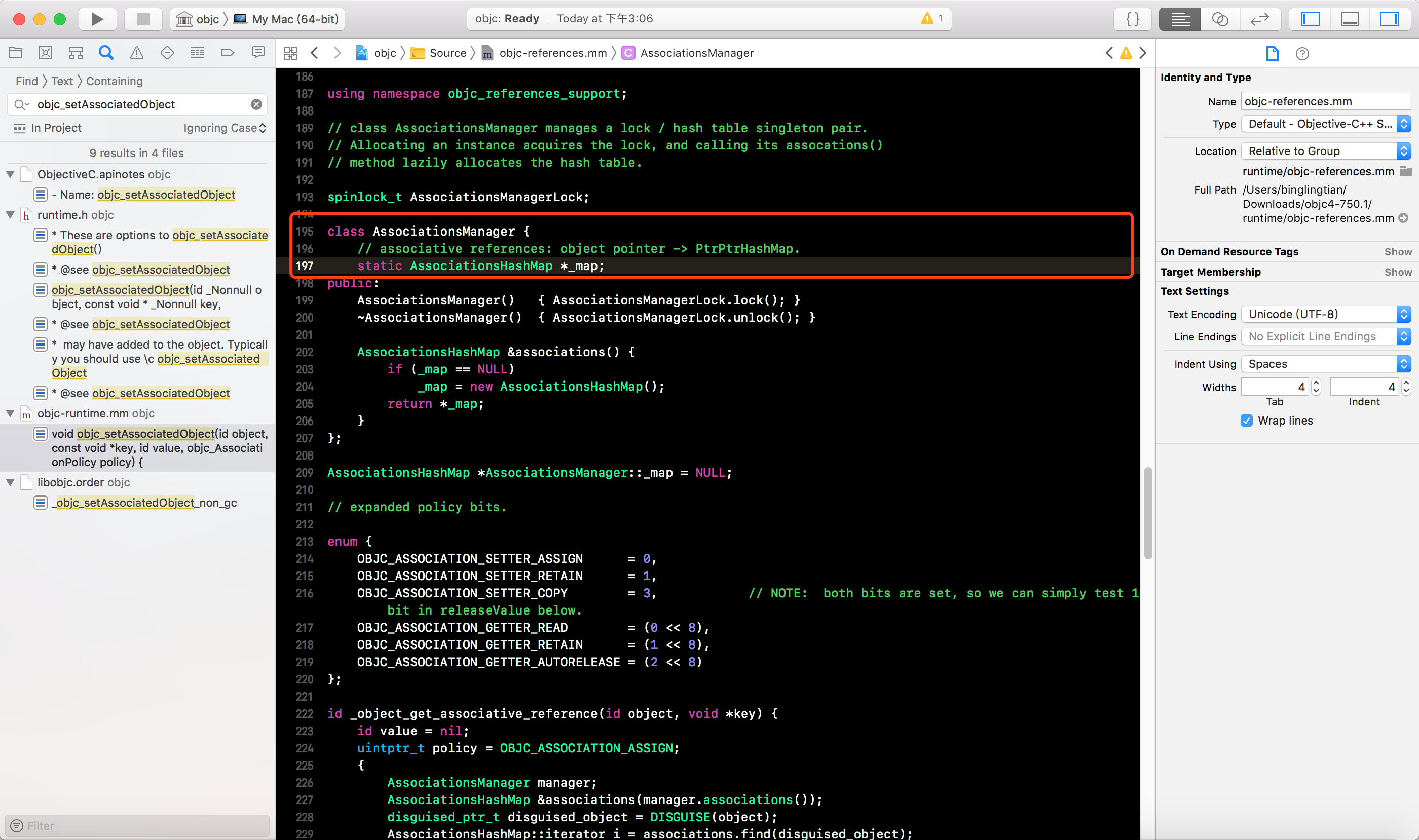 _object_set_associative_reference函数中, 可以看到代码AssociationsManager manager;