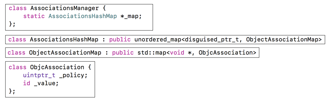AssociationsHashMap中, 之前说过AssociationsHashMap类似于OC中的字典, 所以他也有key和value AssociationsHashMap的key是disguised_ptr_t,value是ObjectAssociationMap *