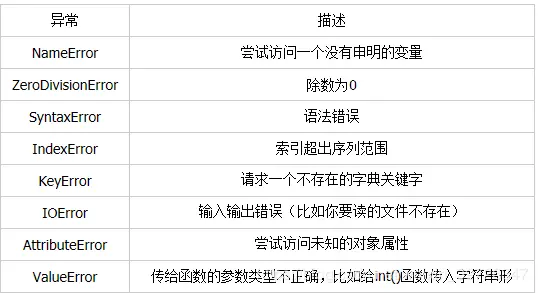 异常就是程序运行时发生错误的信号,在python中,错误触发的异常如下。异常发生之后,异常之后的代码就不执行了