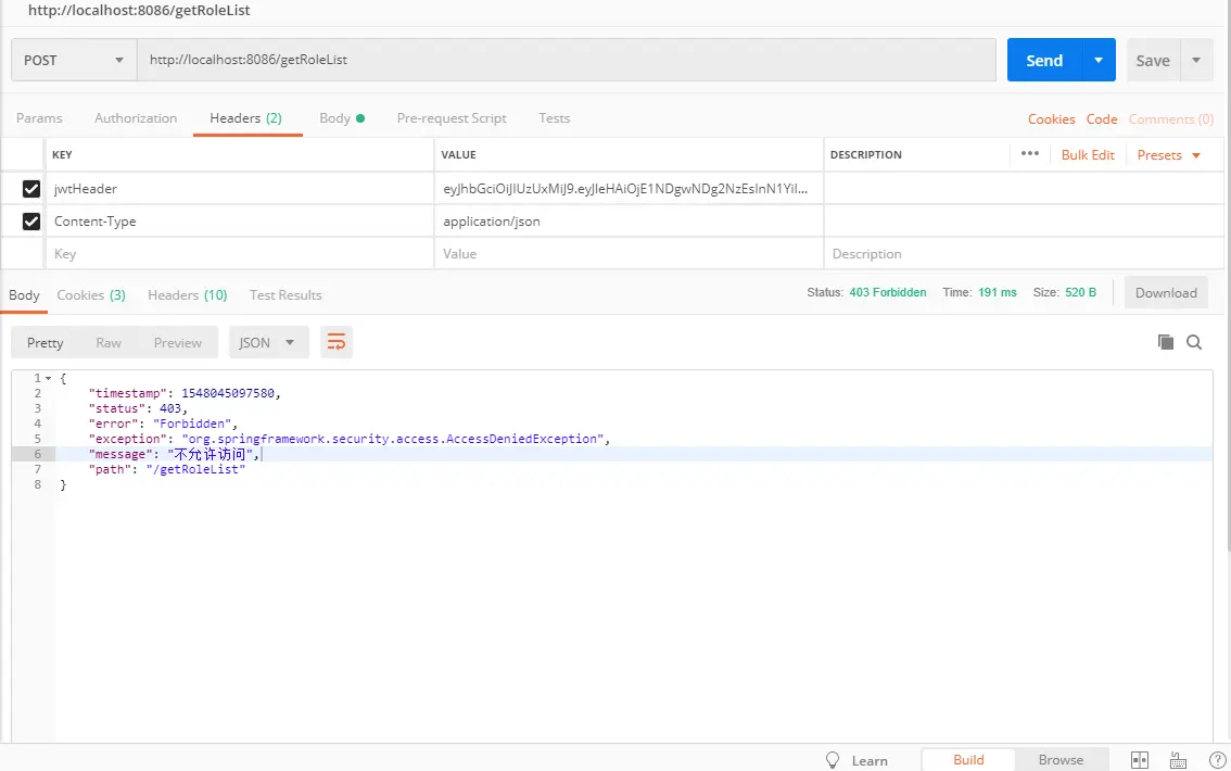 使用本系统的系统管理员和测试用户分别使用Postman测试,这是测试用户访问进行访问时,会抛出AccessDeniedException权限不足。
