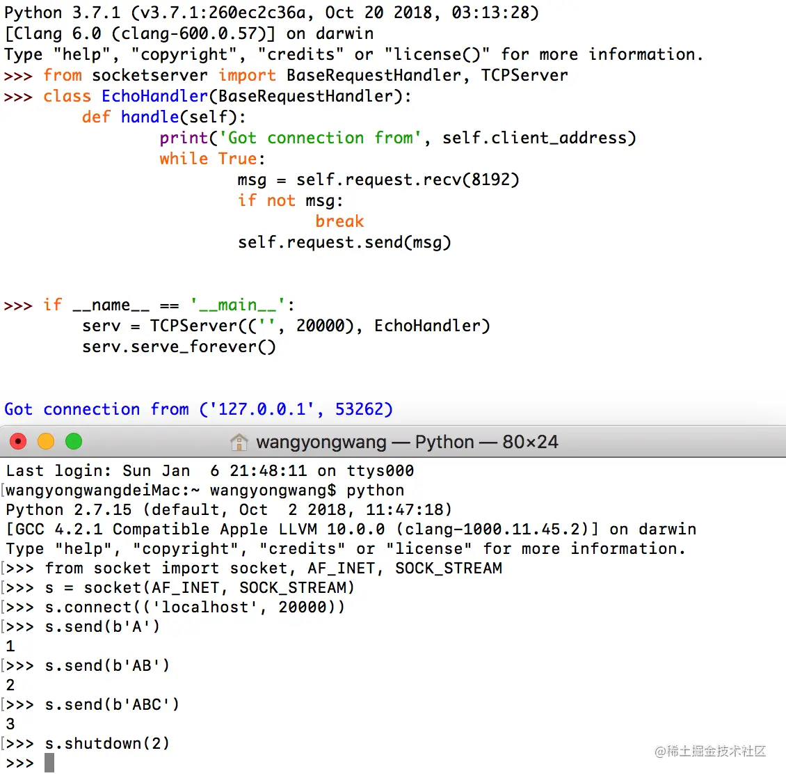 笔者在前文提到了要用Python创建一个本地TCP服务器,并且分析TCP的请求响应过程。这里笔者使用的是PythonIDE、Mac自带的终端简单创建了一个本地TCP服务端和客户端。