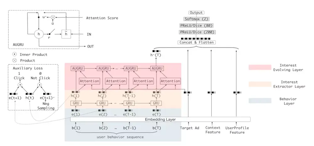 对比DIN的结构,主要区别在于增加了兴趣抽取层和兴趣进化层(RNN)