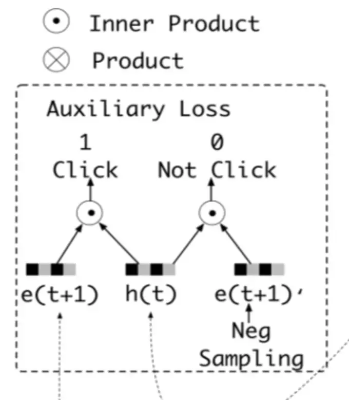 在此之后,为了进一步保证兴趣抽取的准确,作者设计了一个二分类网络,用下一刻的真实行为加GRU的状态拼接作为正例,抽取的假行为拼接GRU状态作为负例,输入二分类网络