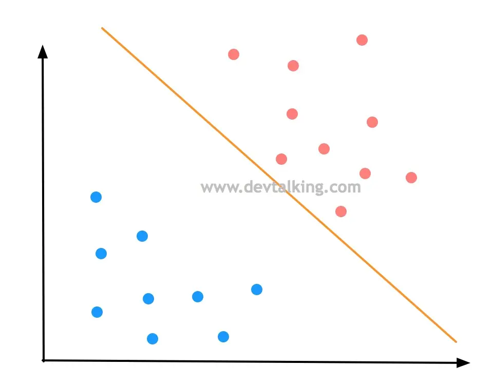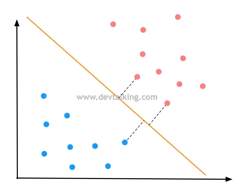 上面的图展示的是一个二分类问题,在逻辑回归的笔记中,我们知道了决策边界,图中橘黄色的直线就是决策边界,它看似很好的将样本数据的不同分类区分开了。我们在多项式回归的笔记中,讲过模型泛化的问题,一个模型的好坏程度很大程度上是体现了模型泛化能力的好坏,也就是对未知样本的预测能力。