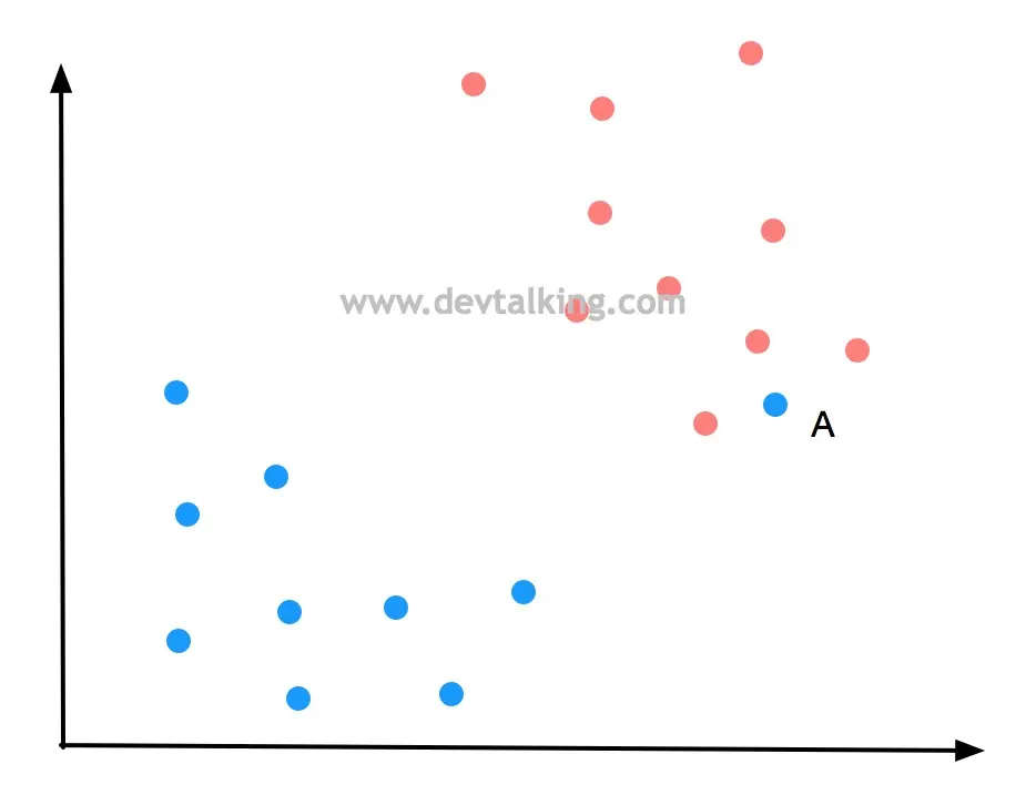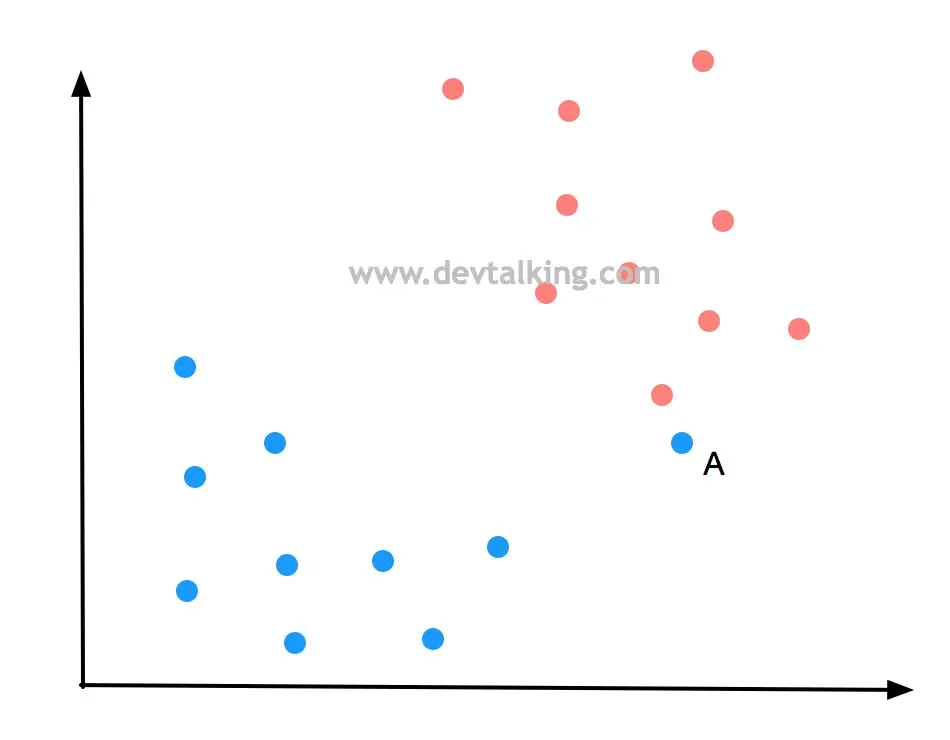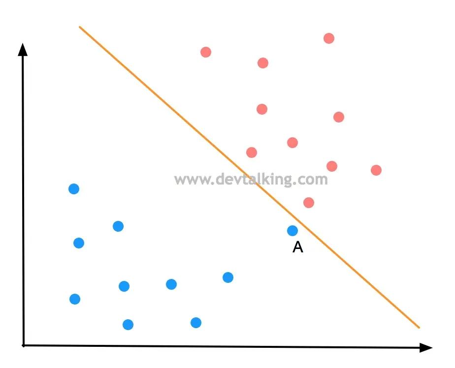 如果新来一个样本数据A,按照决策边界划分它是被分为了蓝色分类,可事实真的是如此吗,因为点A和红色分类的点非常近,很有可能点A是属于红色分类的。所以上图中的决策边界可能并不是最优的,那最优的决策边界应该是什么样的呢?