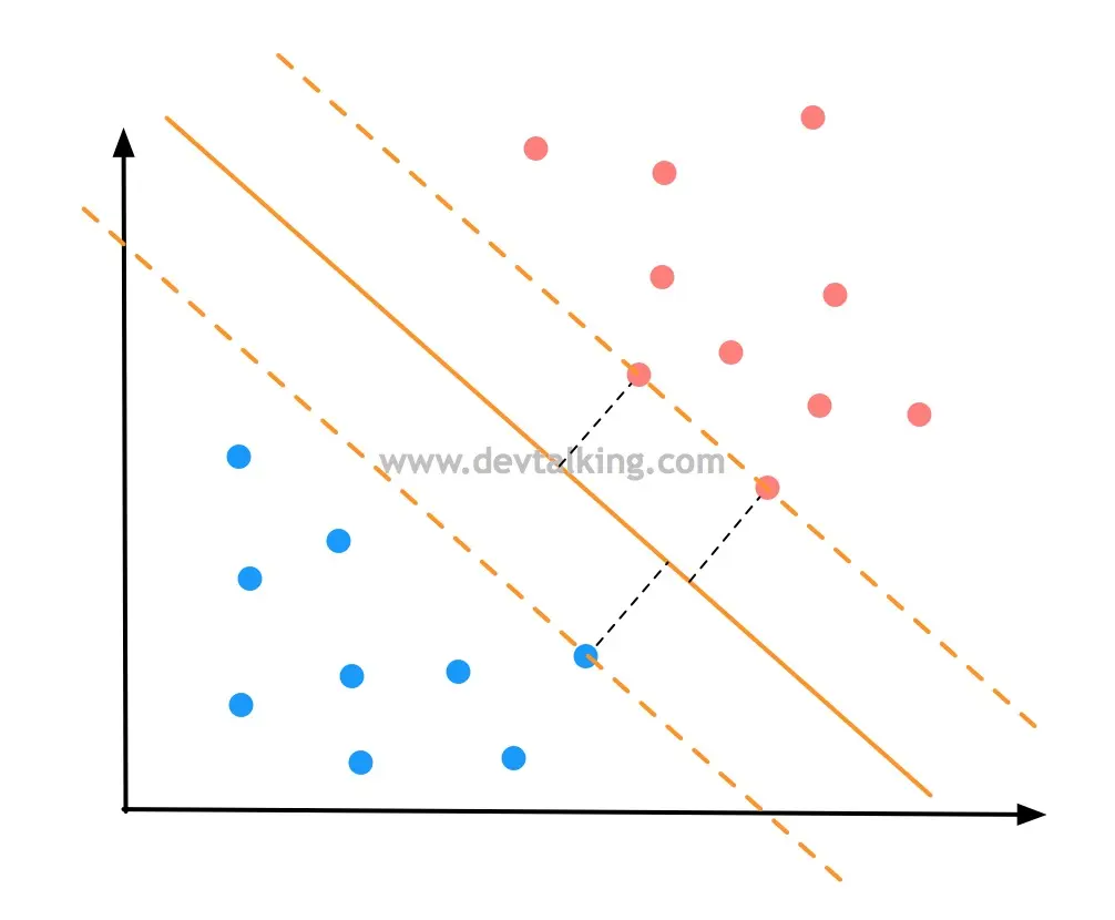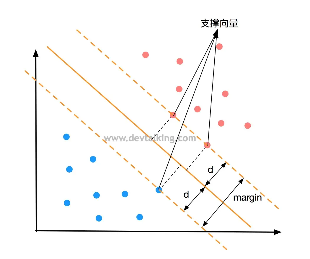想要决策边界离红蓝两个分类都尽可能的远,也就是红蓝分类两边离决策边界最近的点的距离要远,并且两边的点到决策边界的距离要相等,这才说明决策边界是不偏不倚的,如上图所示。