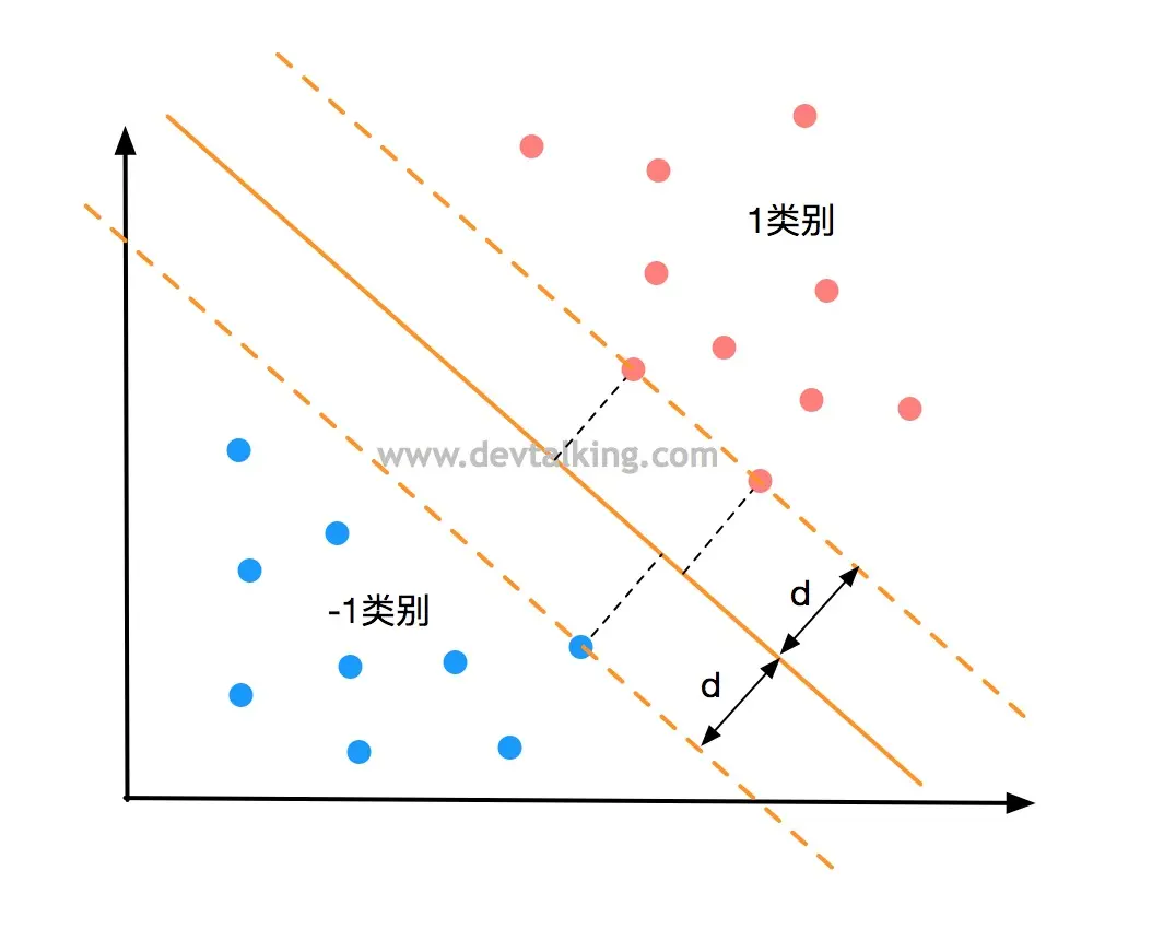 我们将上图中红色点定义为1类别,蓝色点定义为-1类别,那么就有: