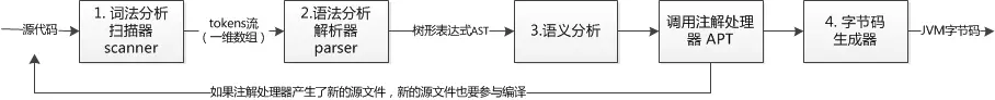 我们看下 Java 的编译过程,重点关注步骤一和步骤二: