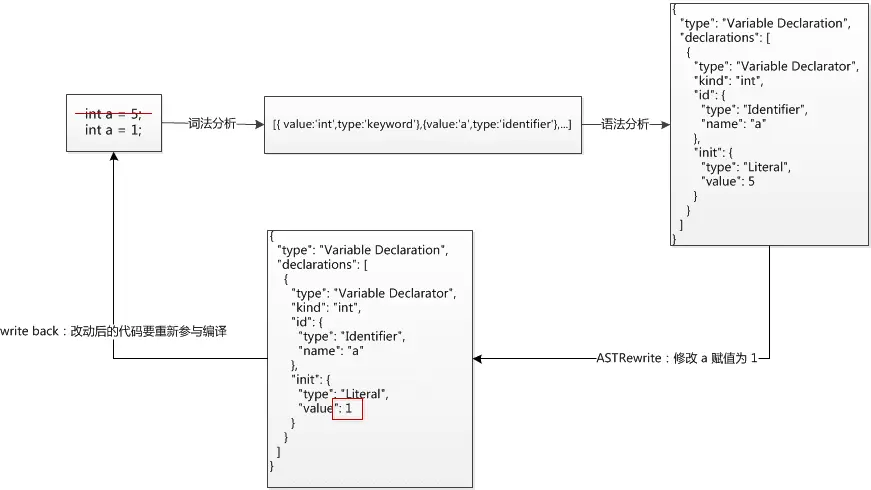 想改 a 的赋值,可以对 AST 语法树的 value 节点下手,一旦改动,编译器会重新进行编译流程处理,此时赋值改动就反映到源码上了。是不是很神奇?其实 Lombok、IDE 语法高亮、IDE 格式化代码、自动补全、代码混淆压缩、甚至大名鼎鼎的 ButterKnife 的 R、R2 文件映射和静态代码检查,都是利用了 AST。