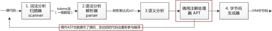 利用 JDK 的注解处理器,可在编译期间处理注解,还可以读取、修改、添加 AST 中的任意元素,让改动后的 AST 重新参与编译流程处理,直到语法树没有改动为止。